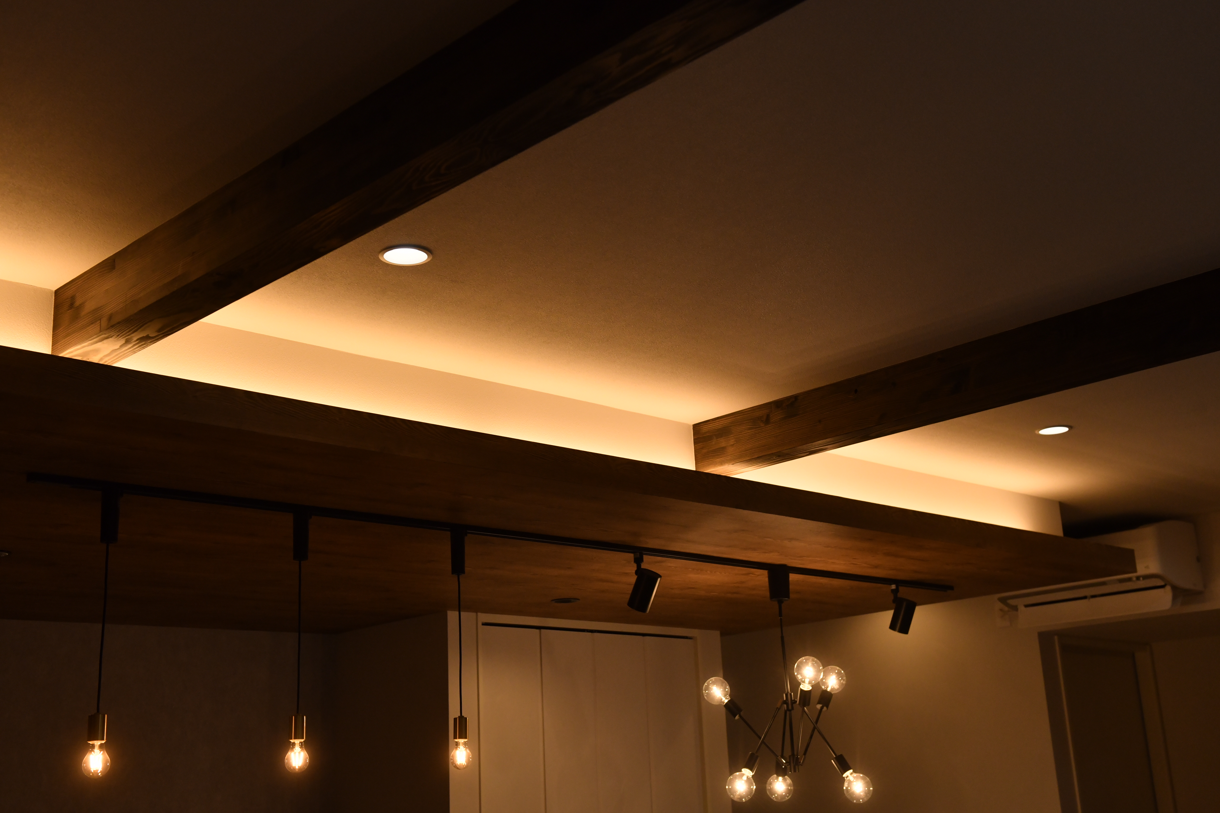 施工内容:新築(回遊型動線、下がり天井&間接照明、造作収納 など)