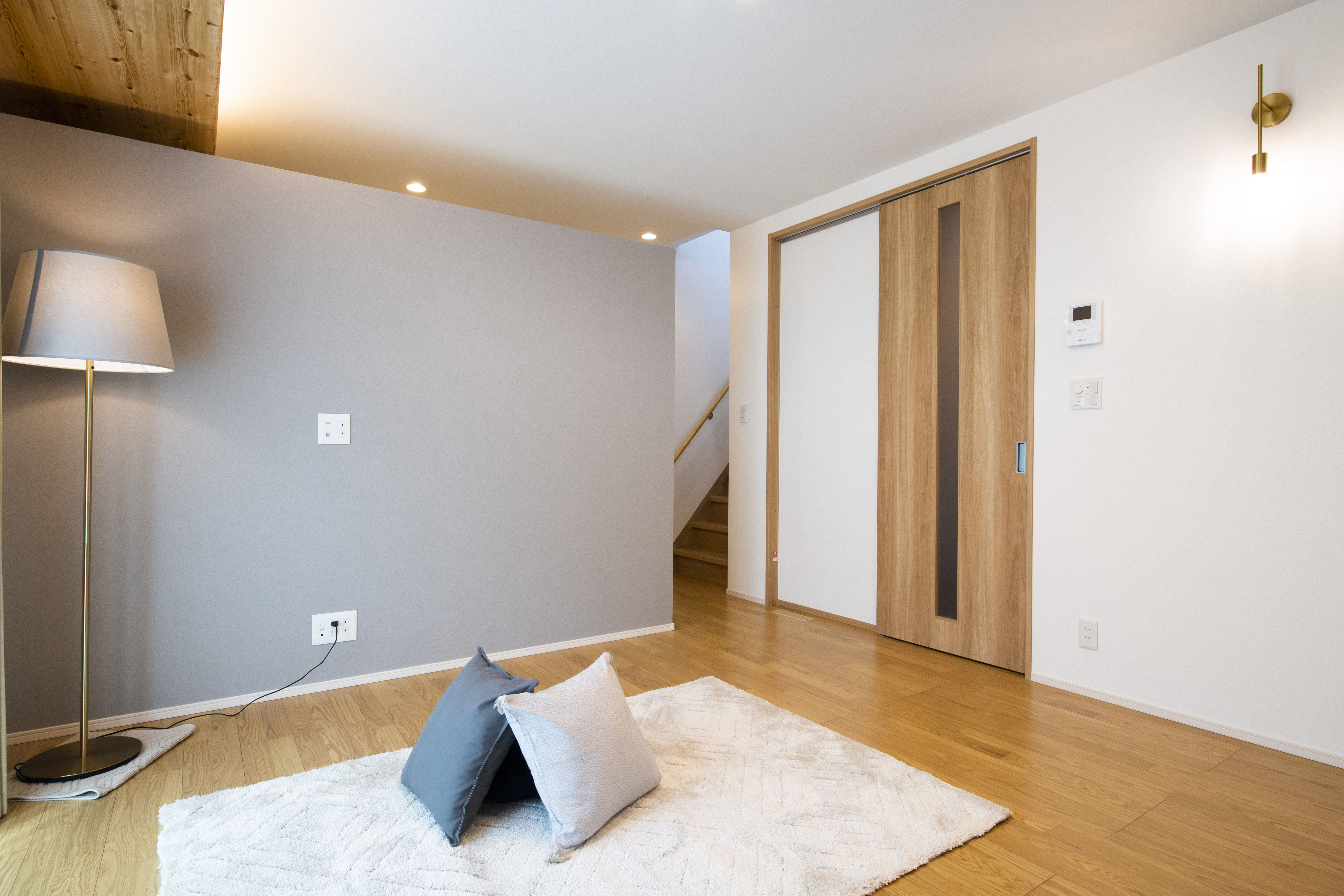 TV背面壁は奥行きを持たせた造作で、立体的な空間演出を実現