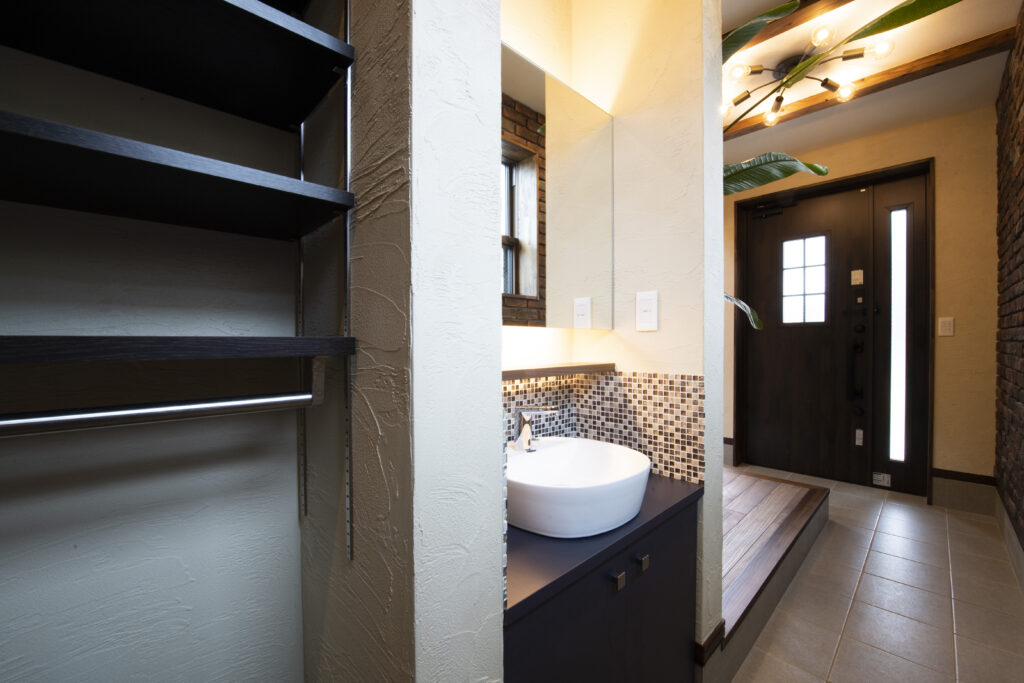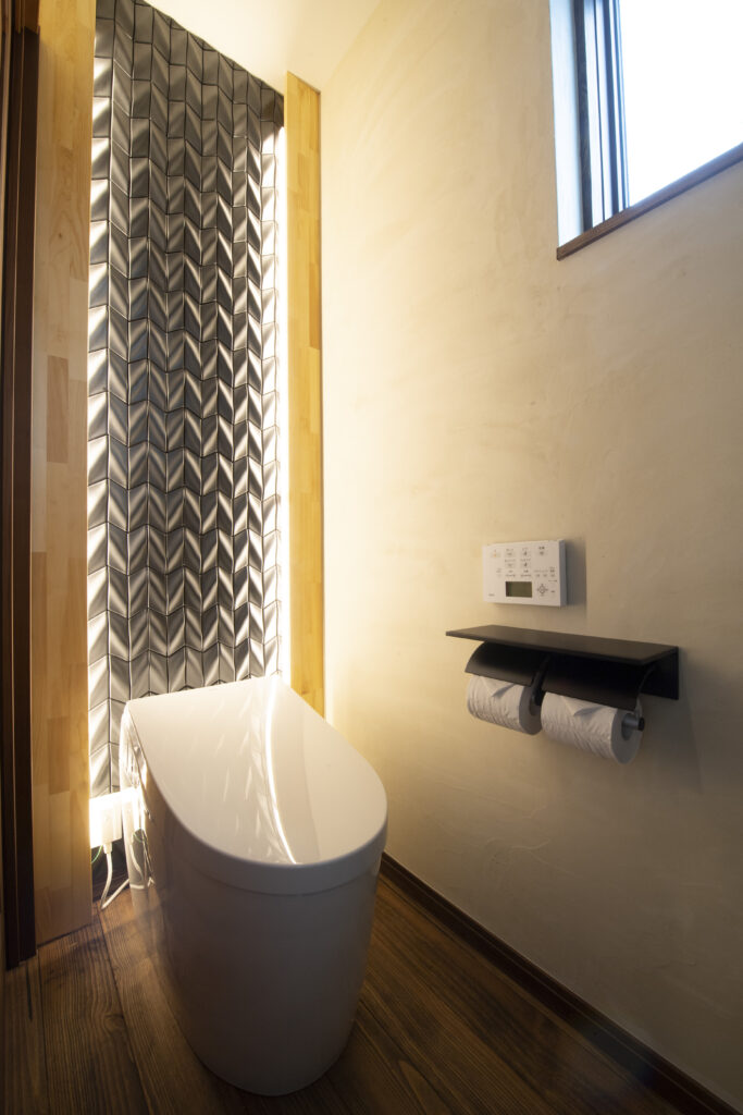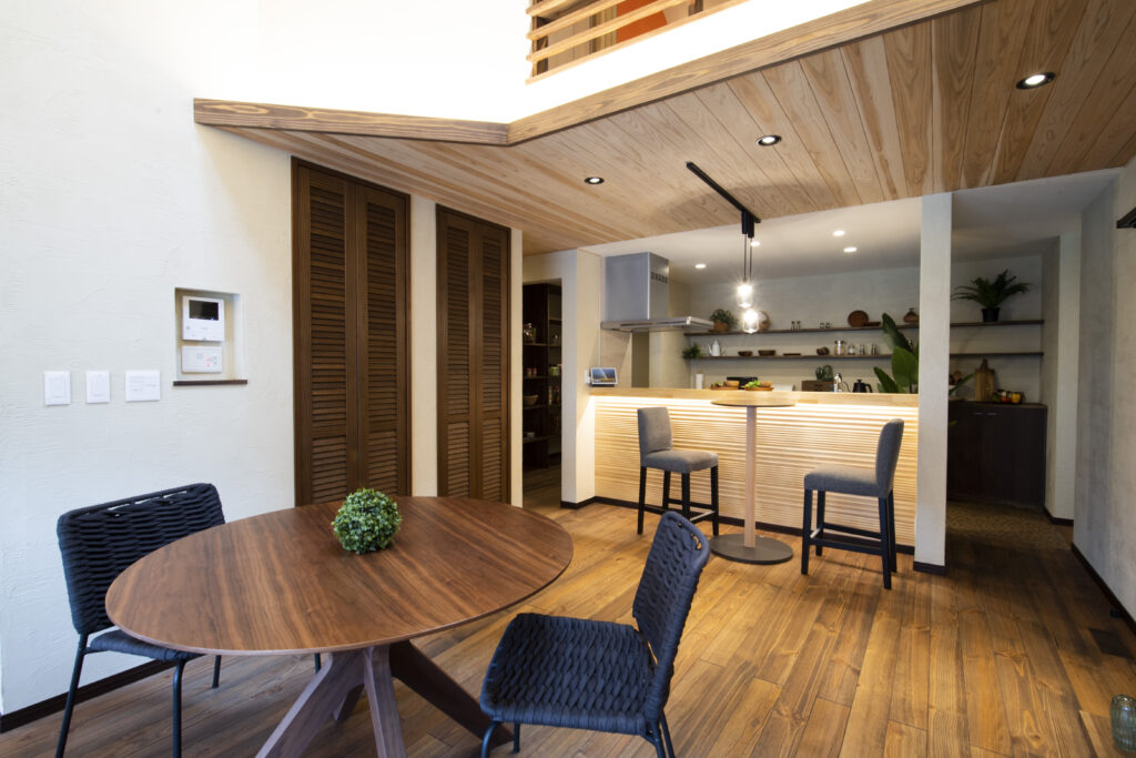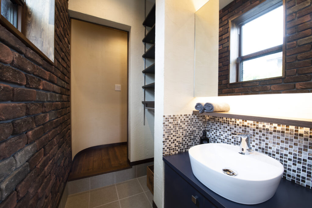 特徴的な壁面・素材:土間のレンガブロック、和室の木製壁、リビング天井の無垢材など、空間ごとに異なる素材の表情が、家全体に奥行きとこだわりを生み出しています。