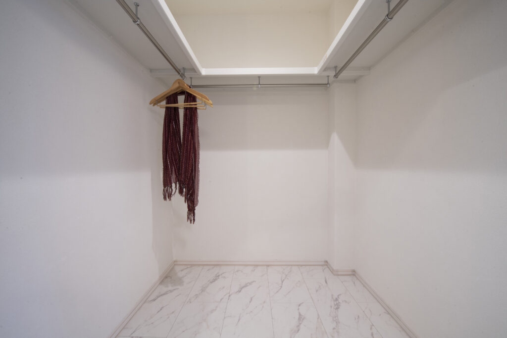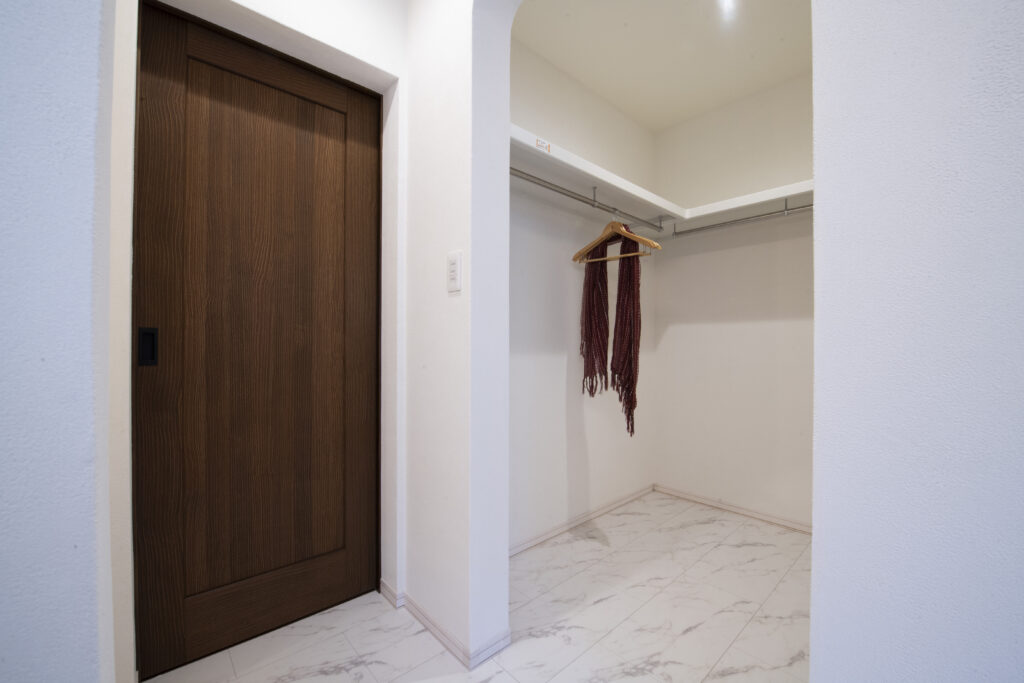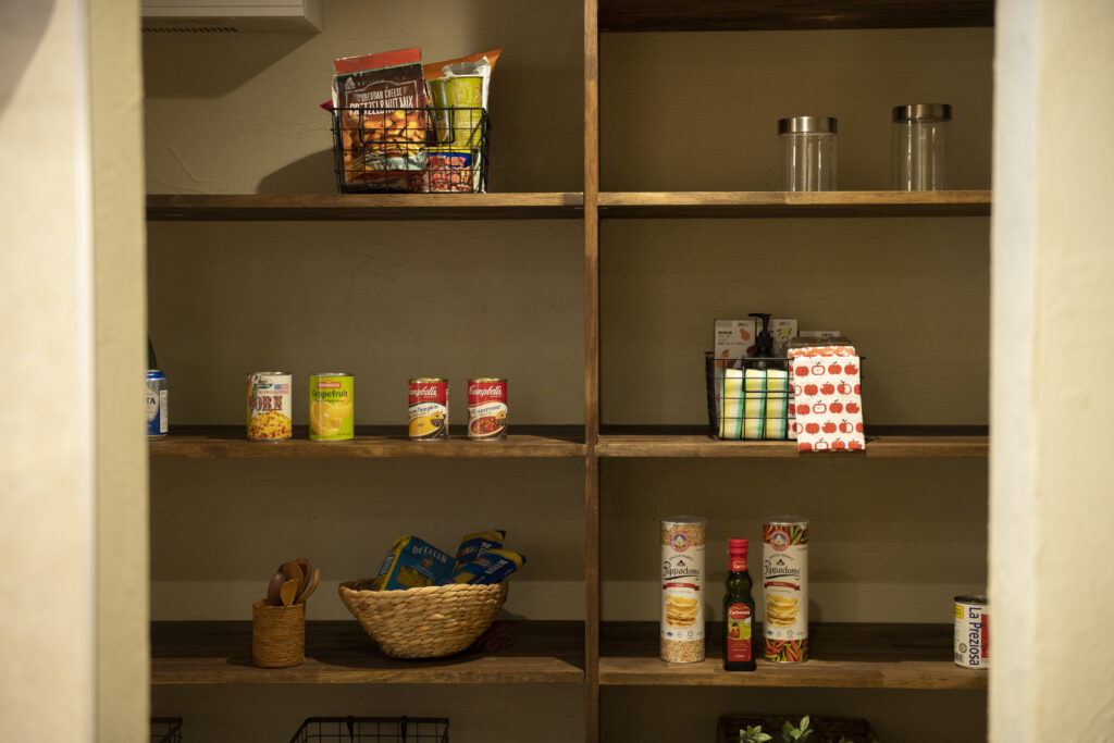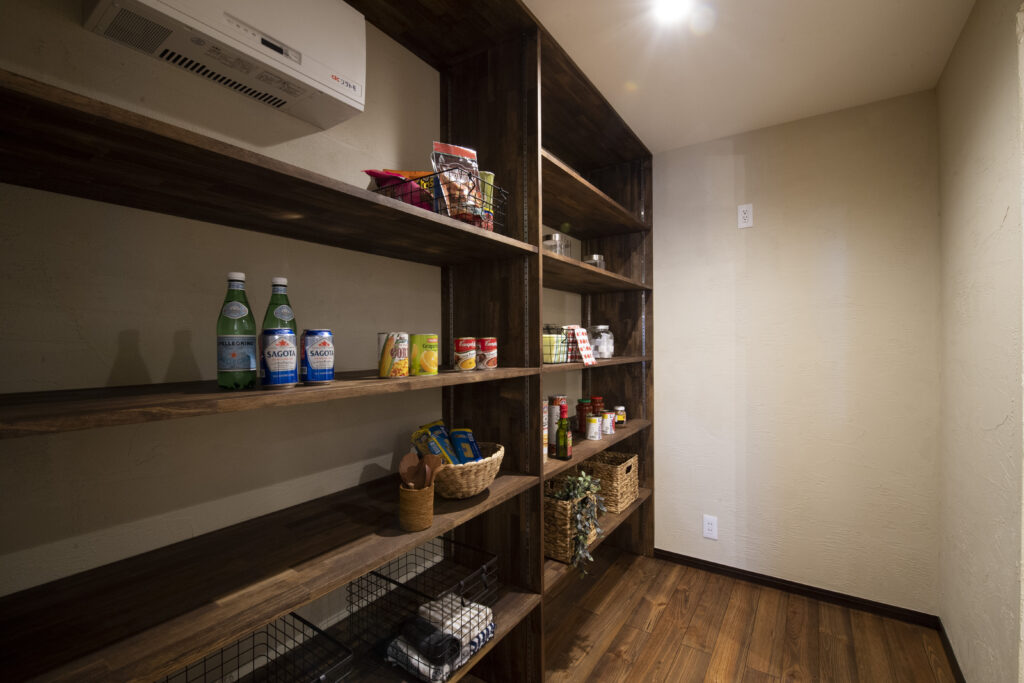 造作収納・パントリー:大容量のパントリーをはじめ、ゴミ箱の目隠しを兼ねたキッチン収納など、見た目もすっきり、使い勝手も抜群の造作収納を随所に配置。