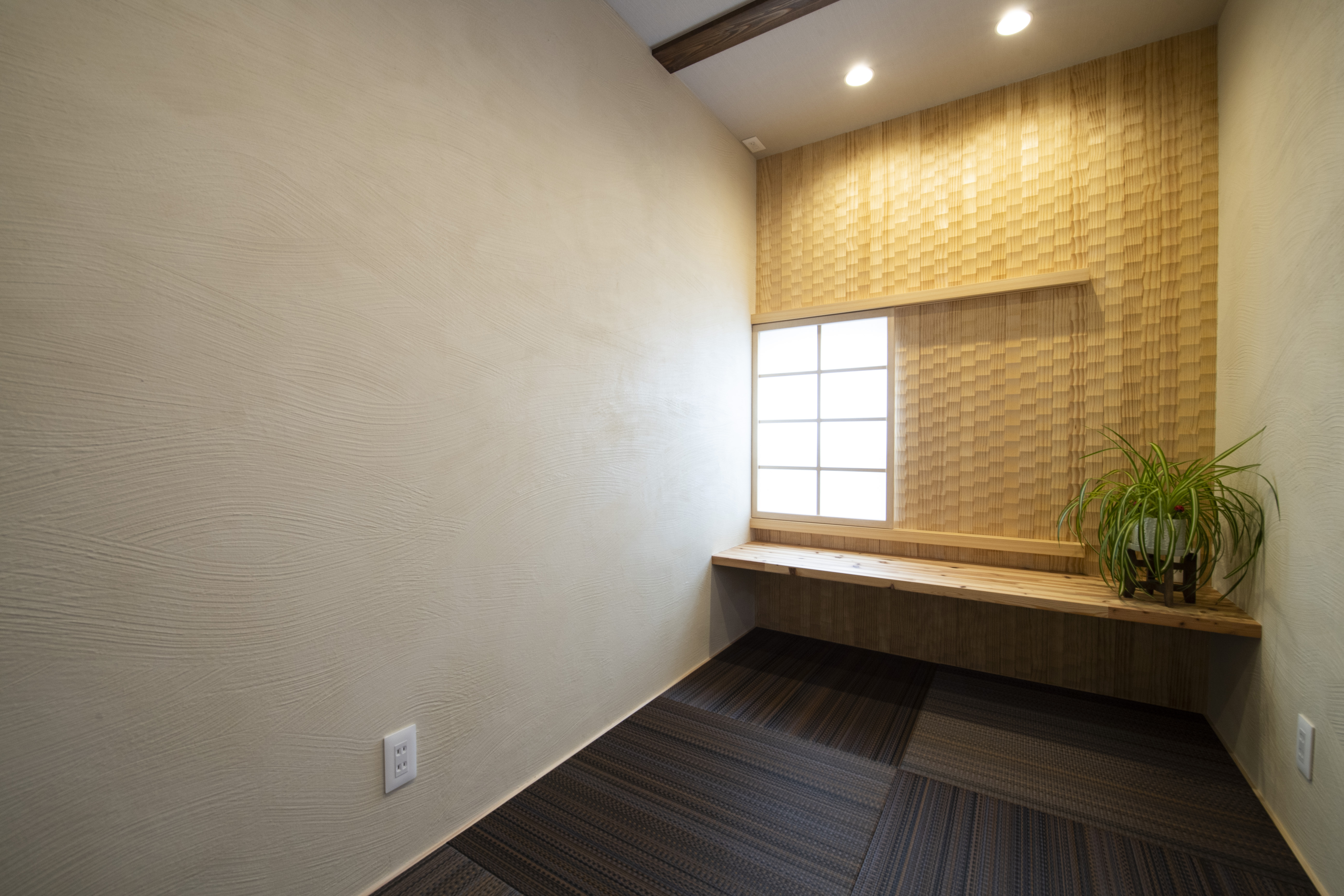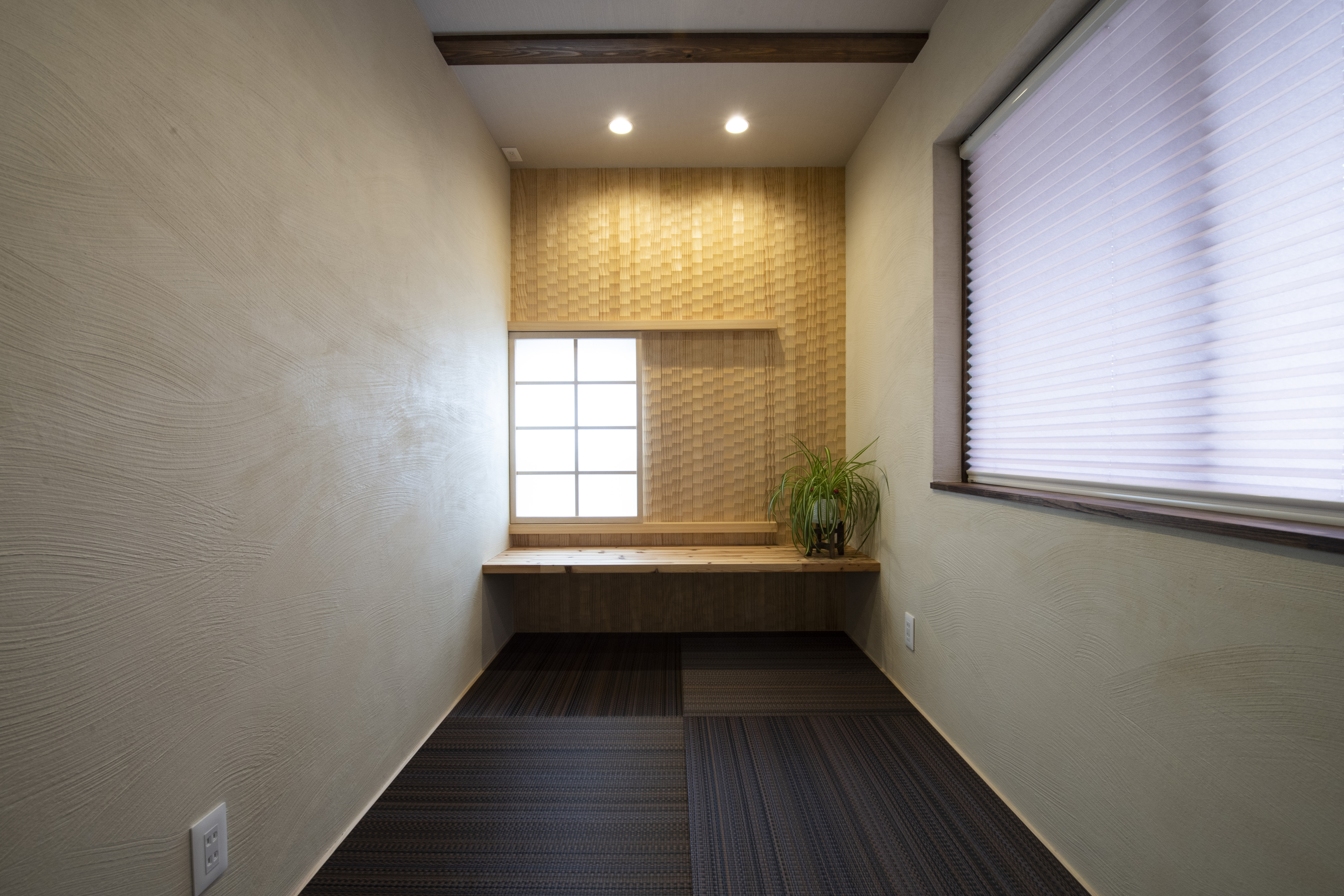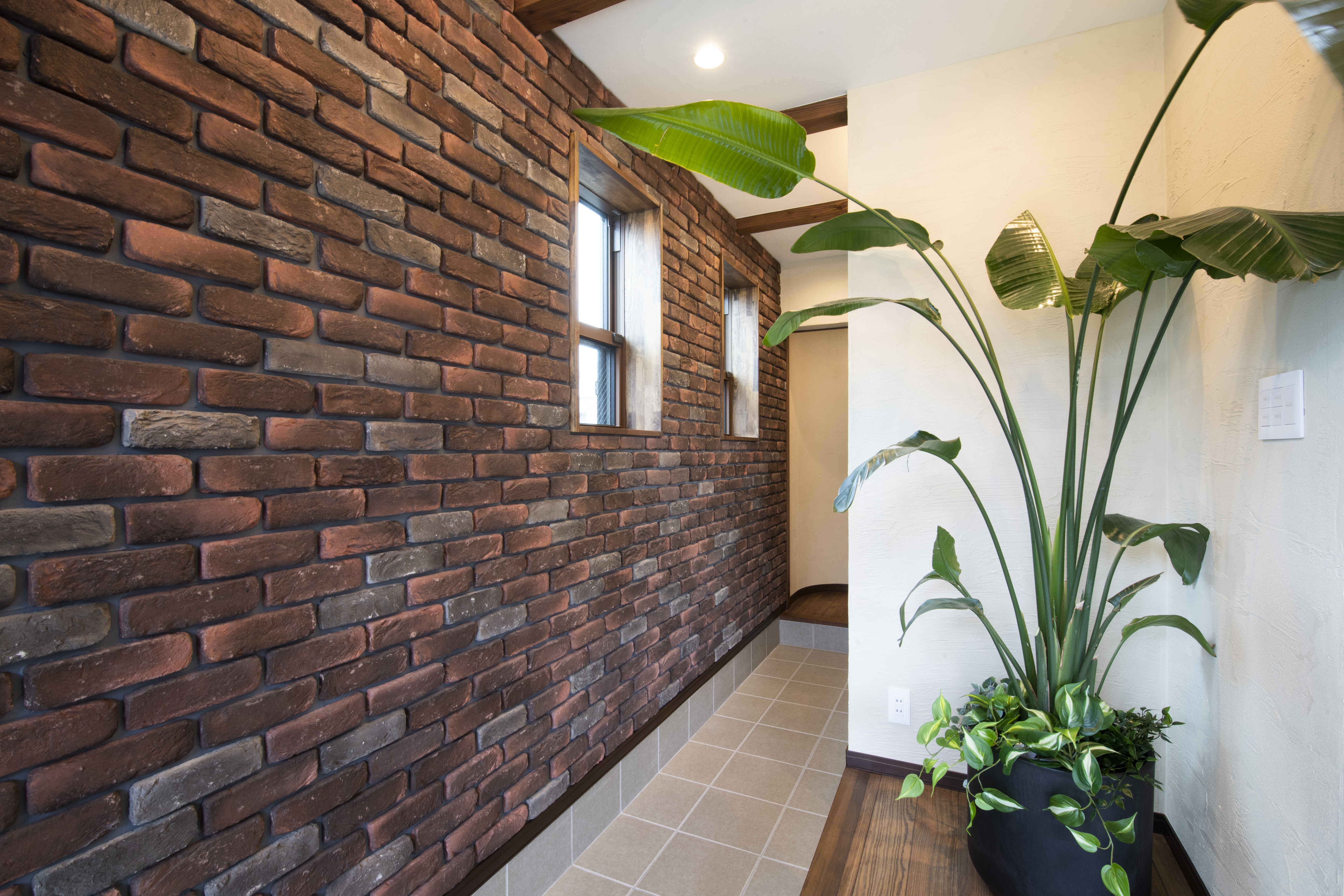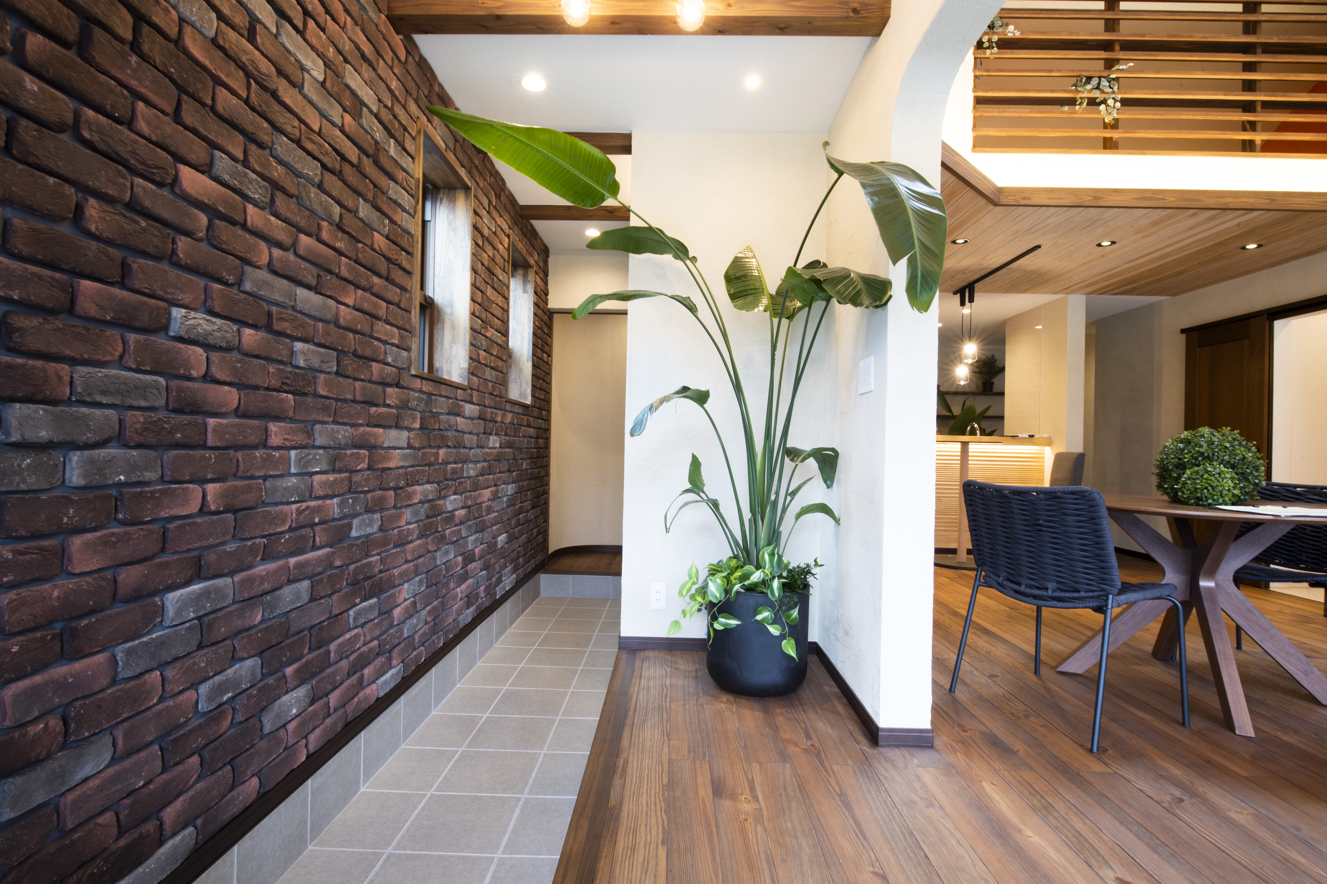 特徴的な壁面・素材:土間のレンガブロック、和室の木製壁、リビング天井の無垢材など、空間ごとに異なる素材の表情が、家全体に奥行きとこだわりを生み出しています。