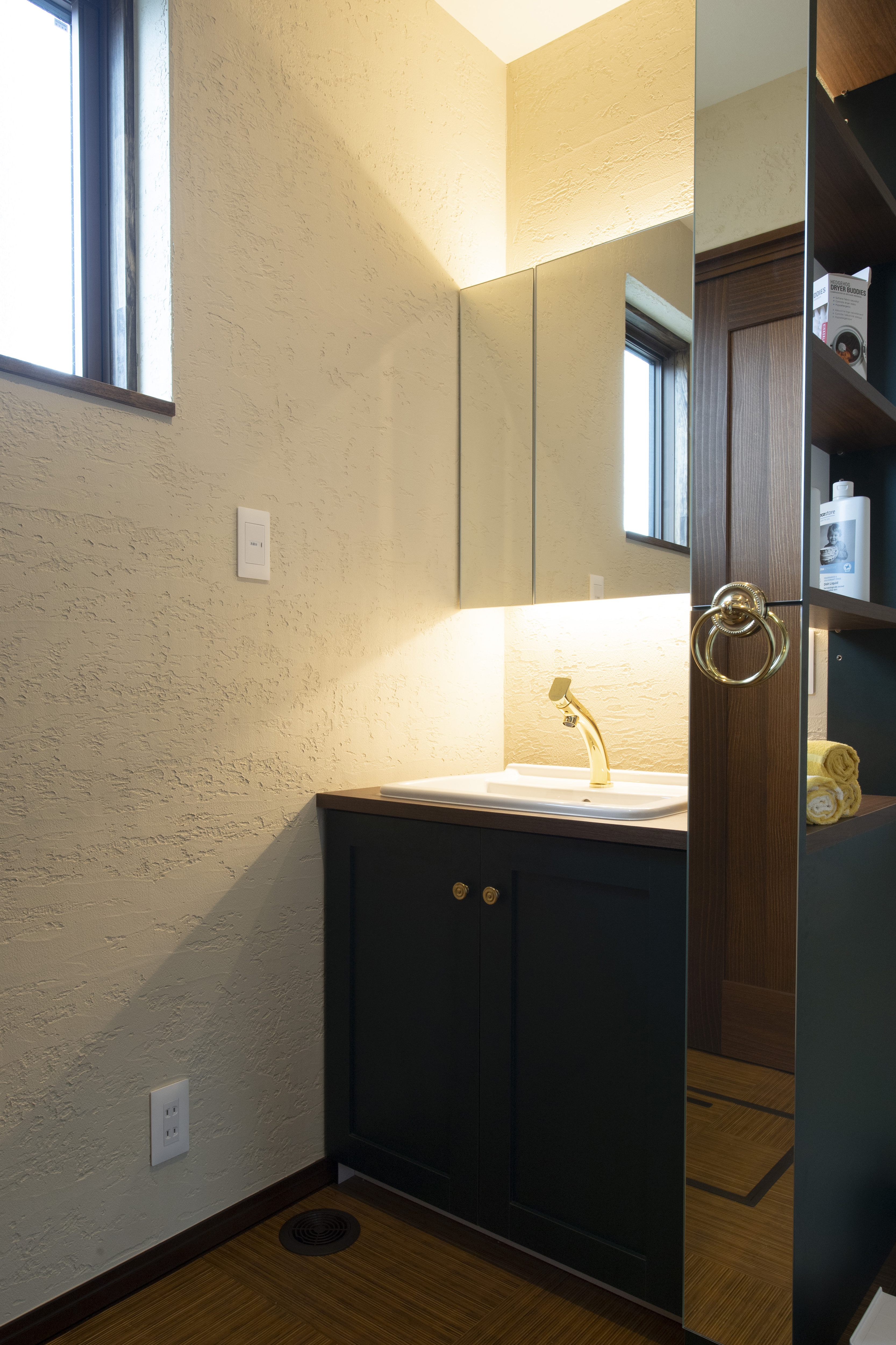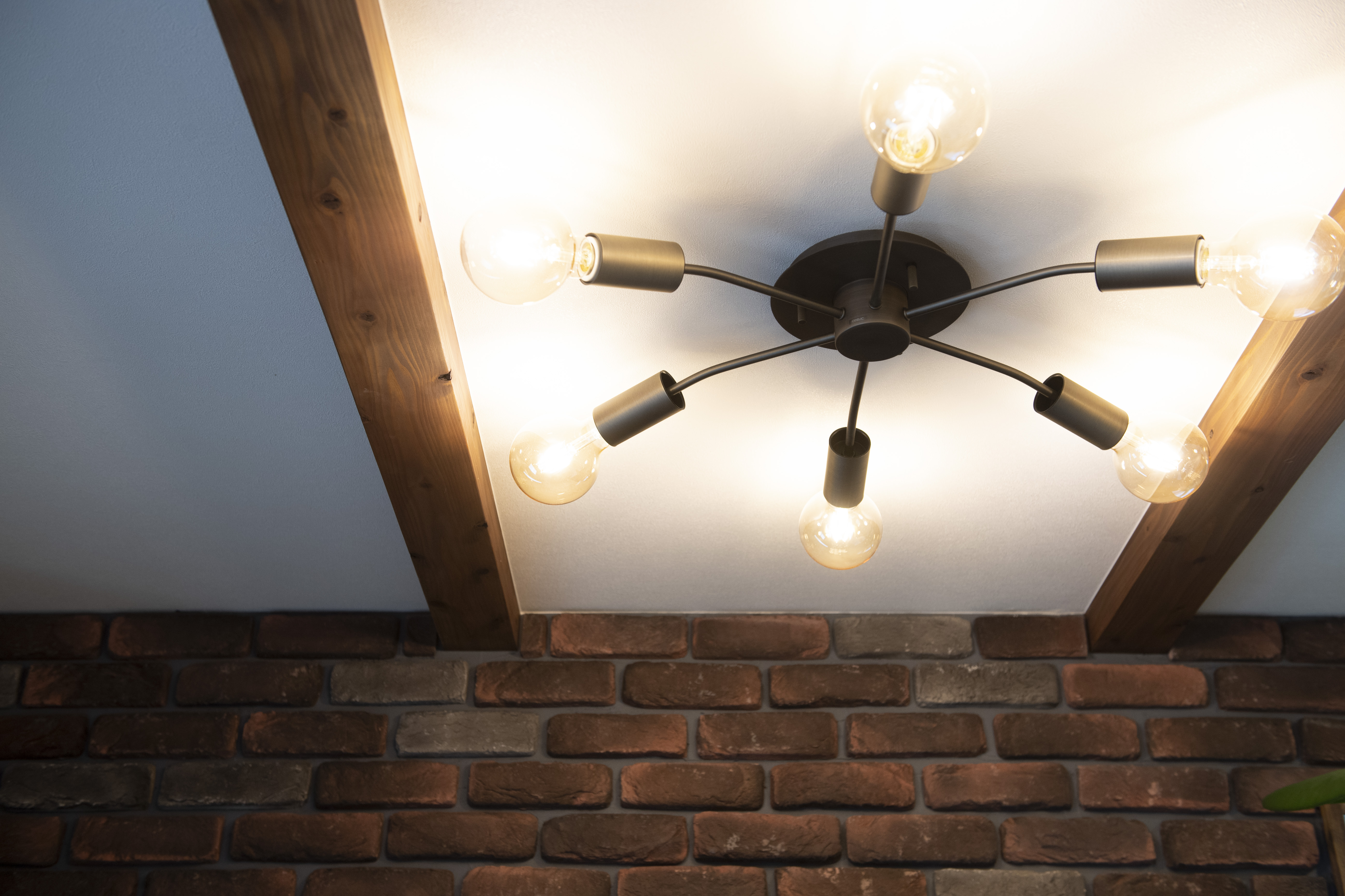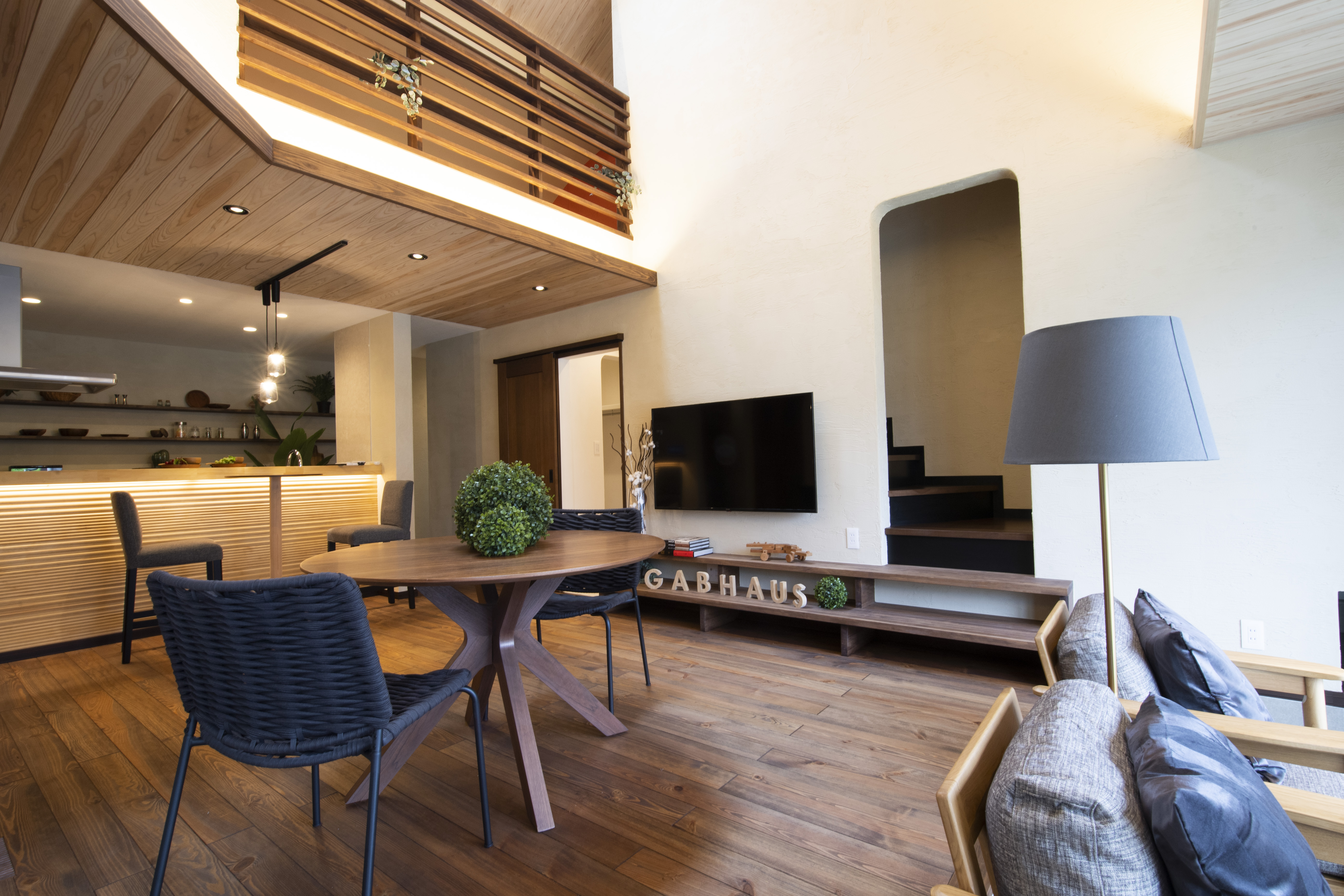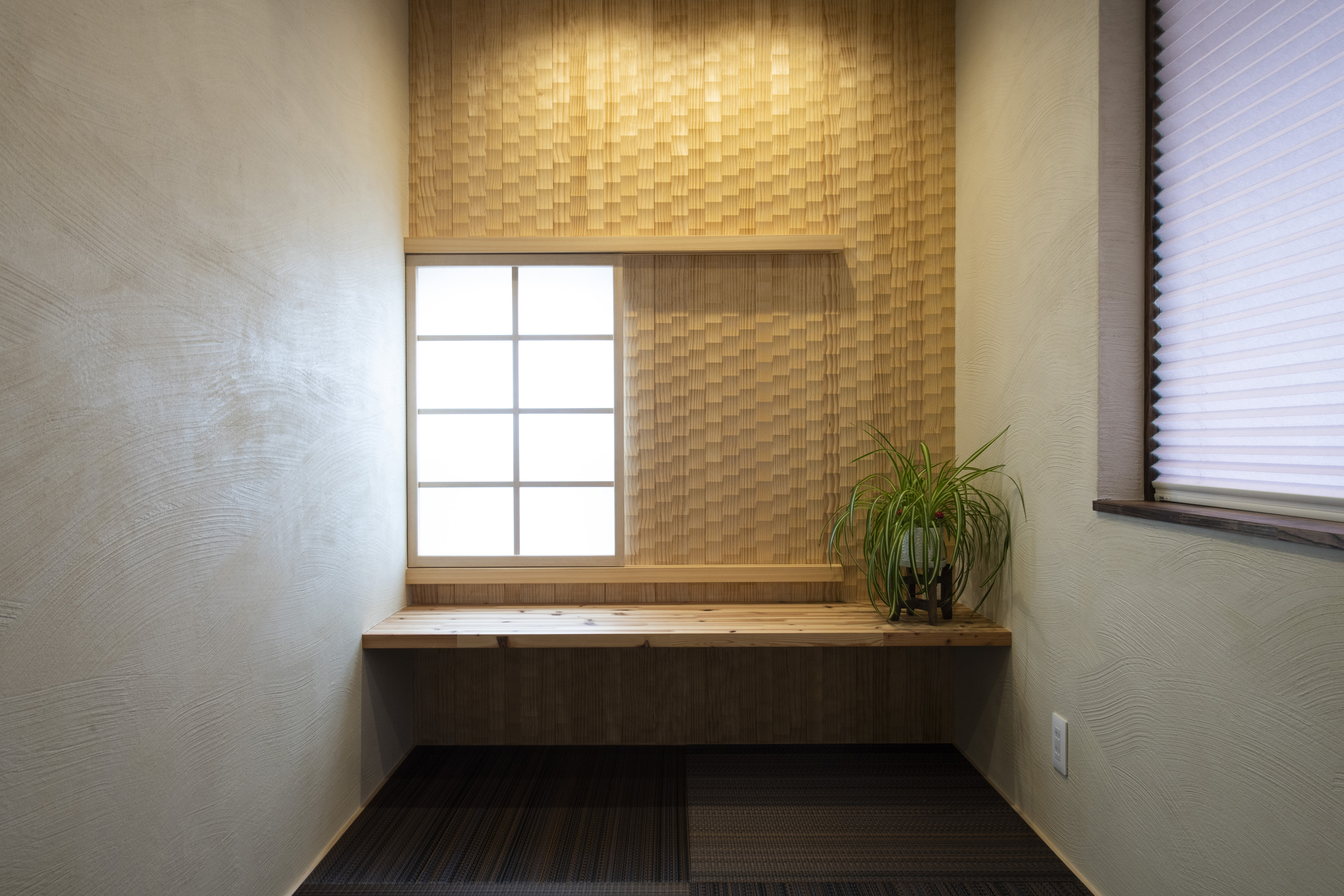 特徴的な壁面・素材:土間のレンガブロック、和室の木製壁、リビング天井の無垢材など、空間ごとに異なる素材の表情が、家全体に奥行きとこだわりを生み出しています。