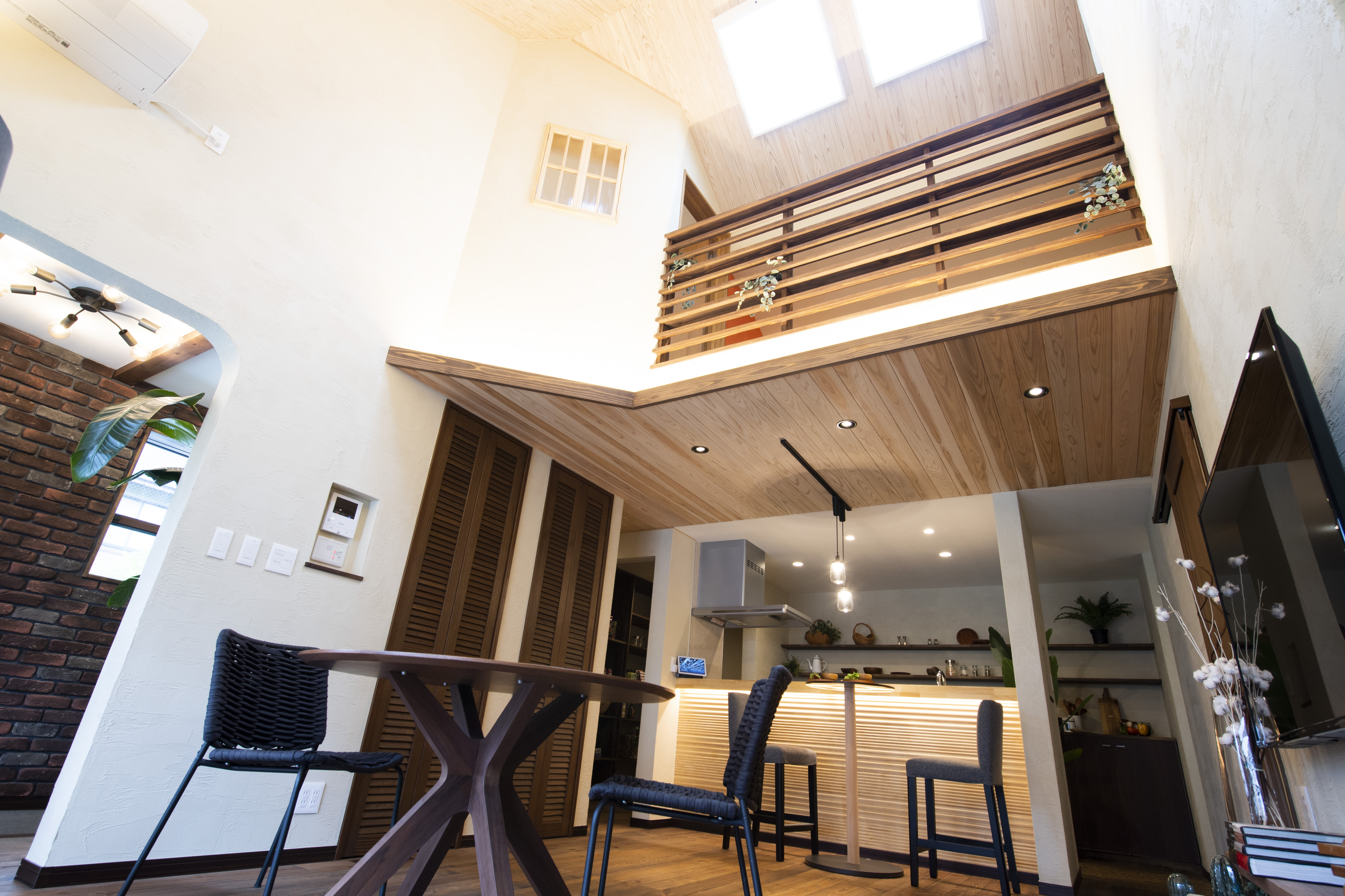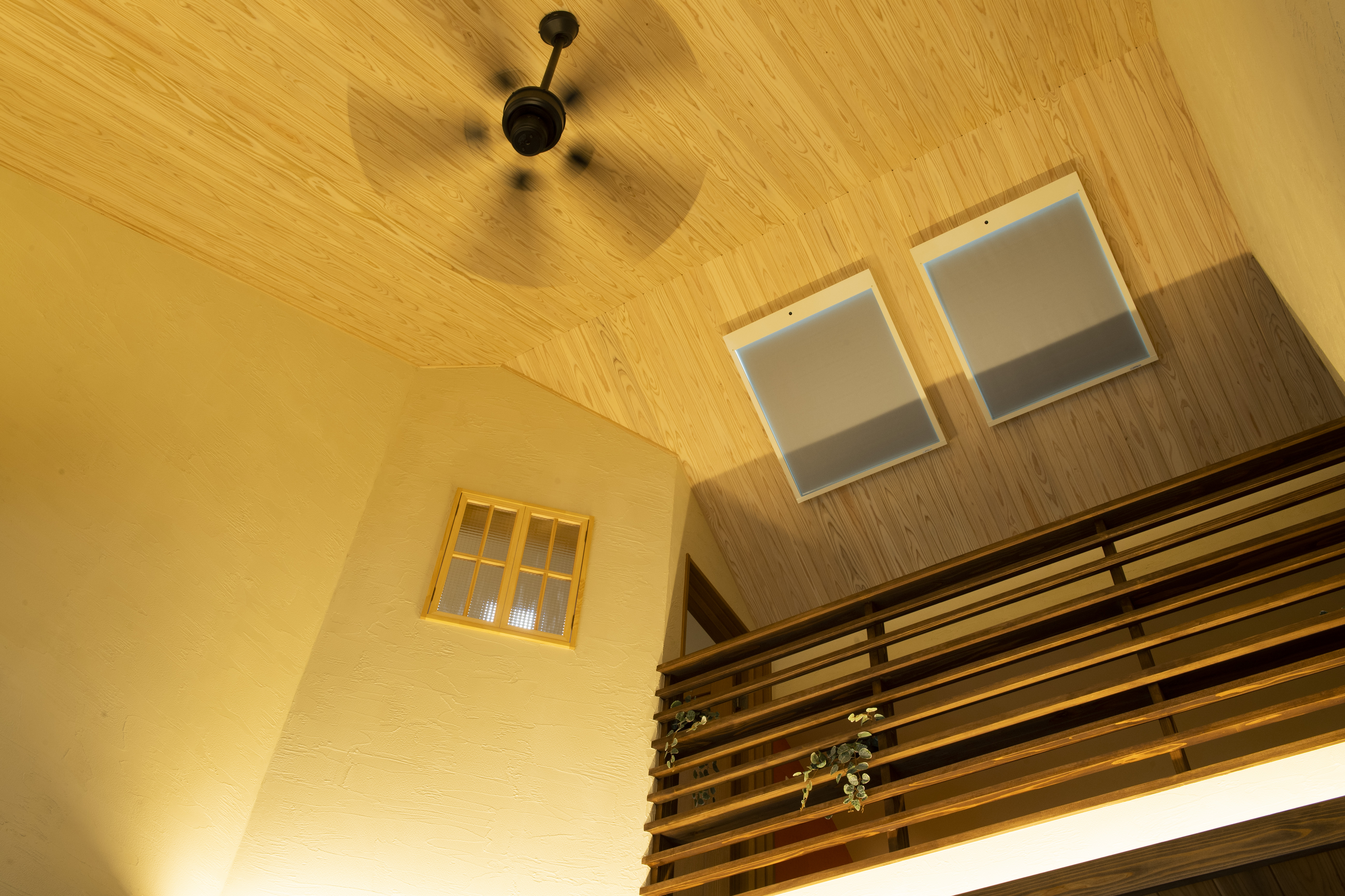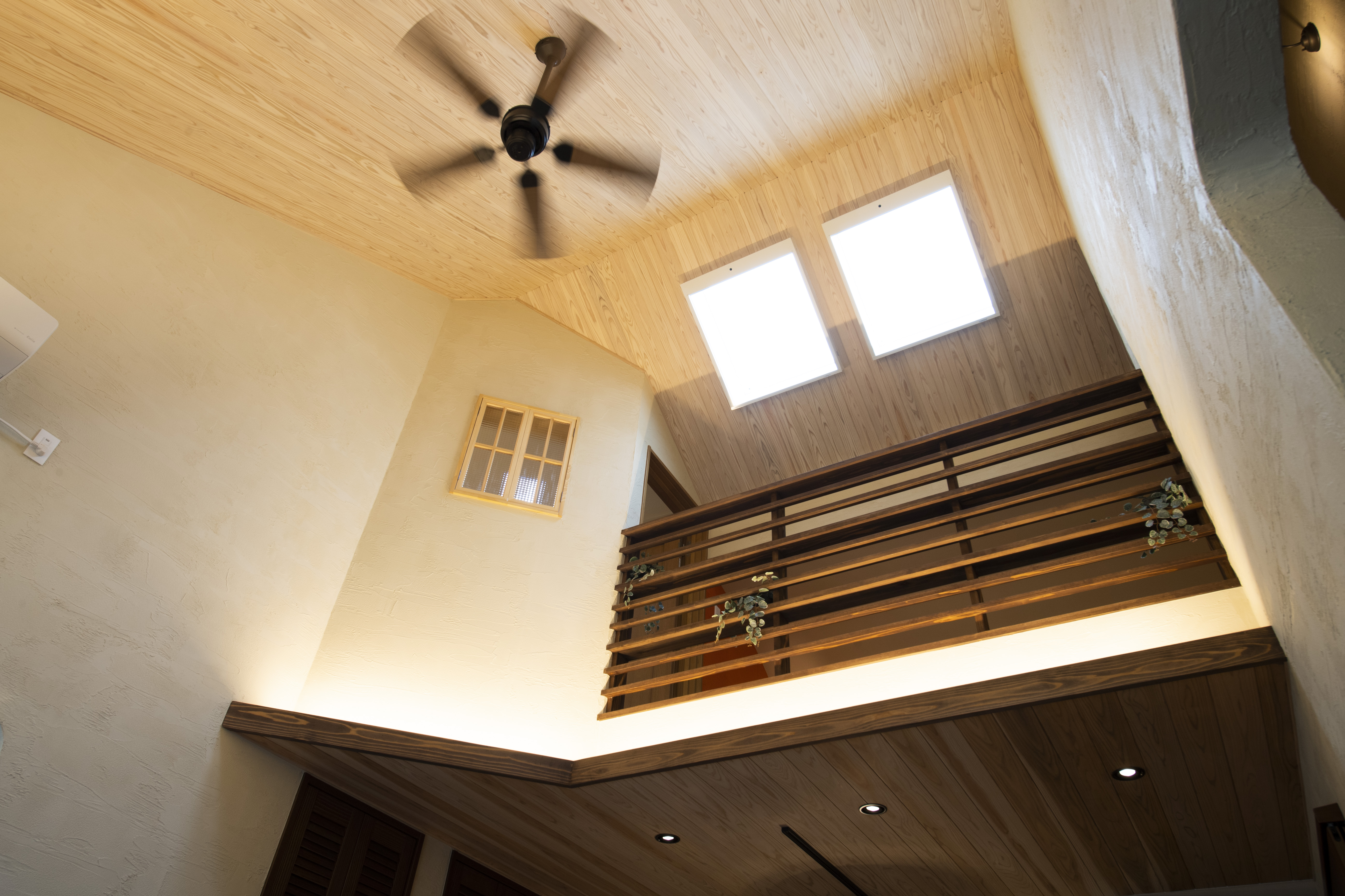 吹き抜け:天窓から差し込むやさしい自然光が、吹き抜けを通じて空間全体をやわらかく包み込みます。