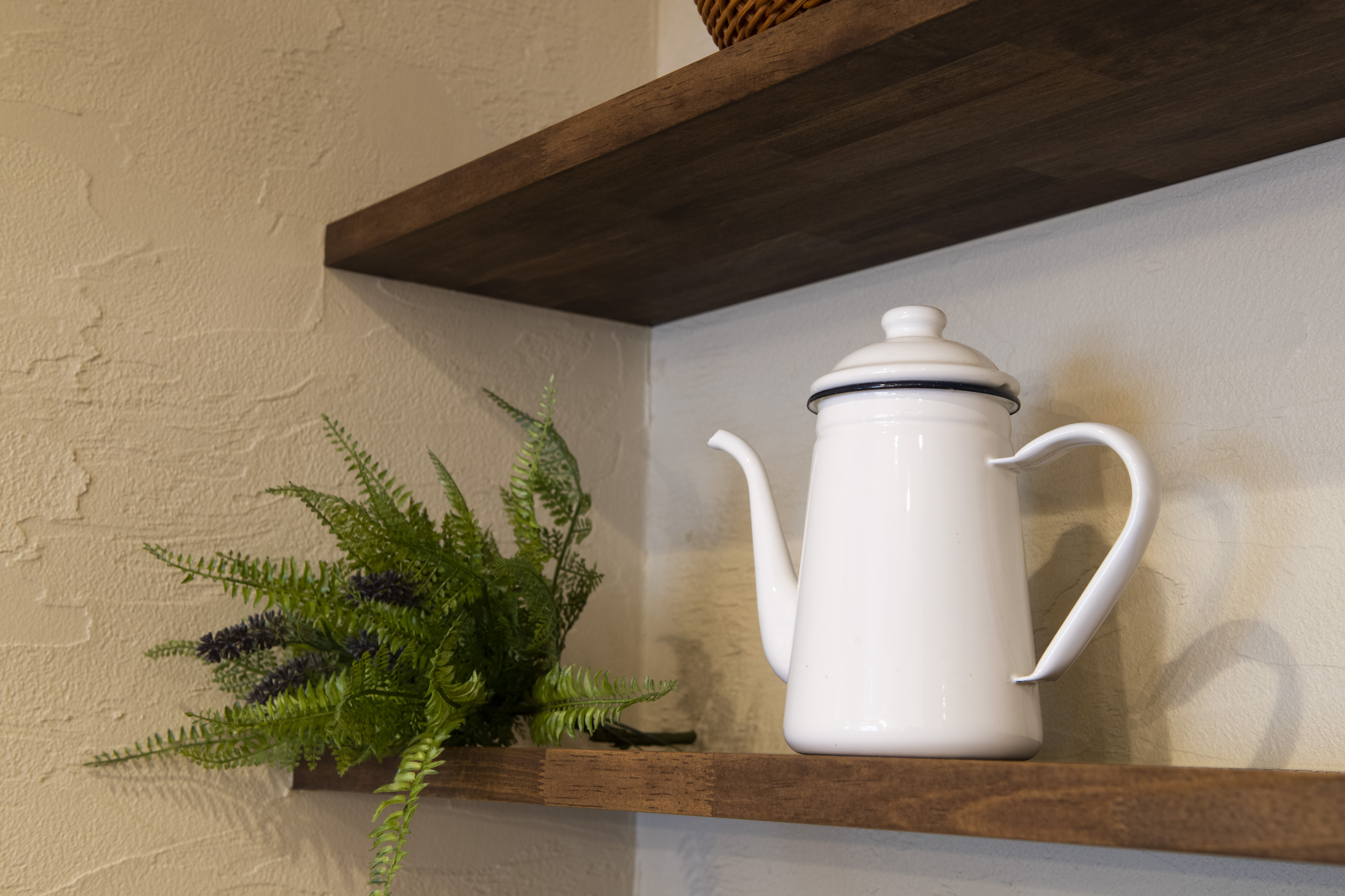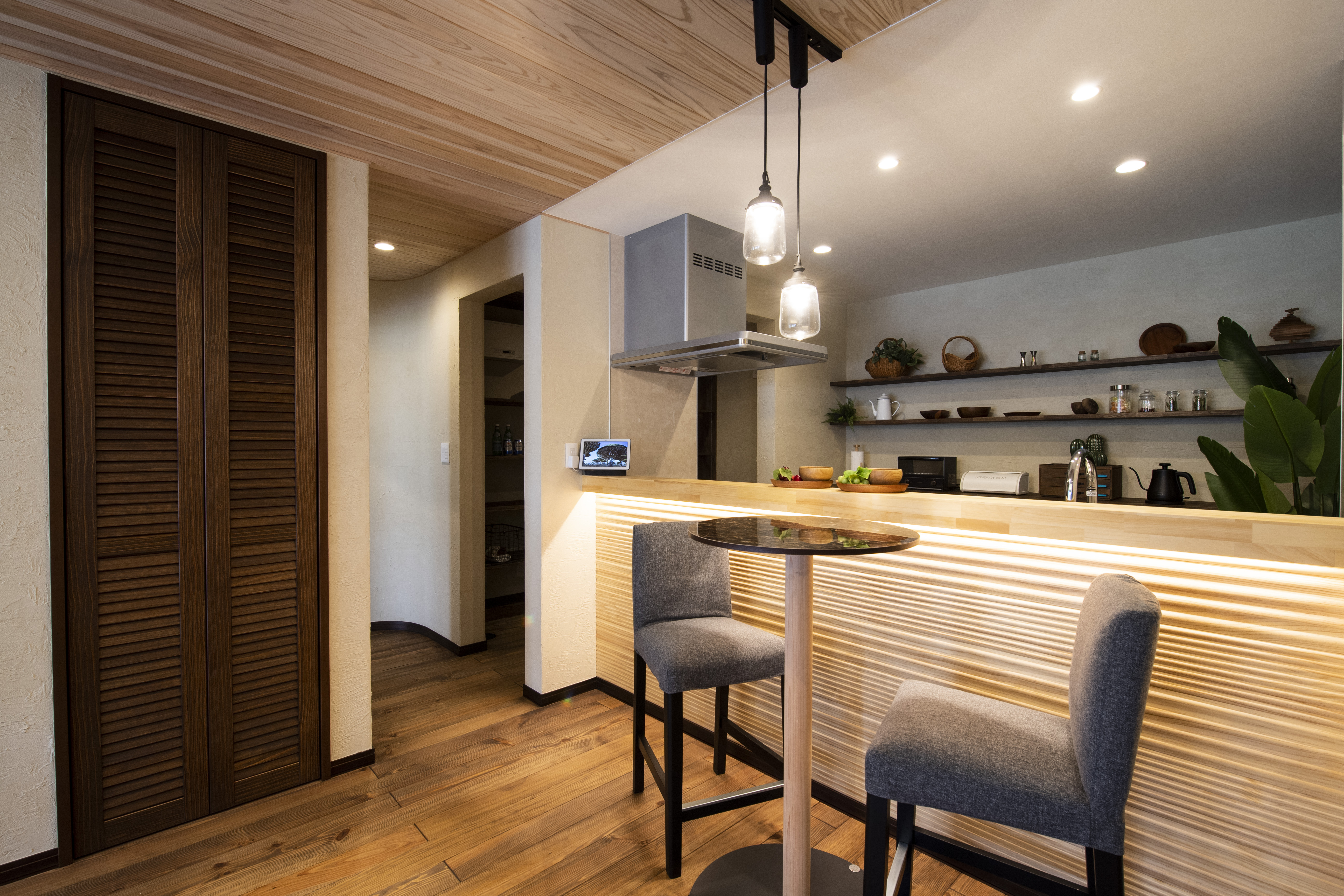 自然素材ならではの「呼吸する壁」が、カフェスタイルの空間に温かみと上質感をプラスしています