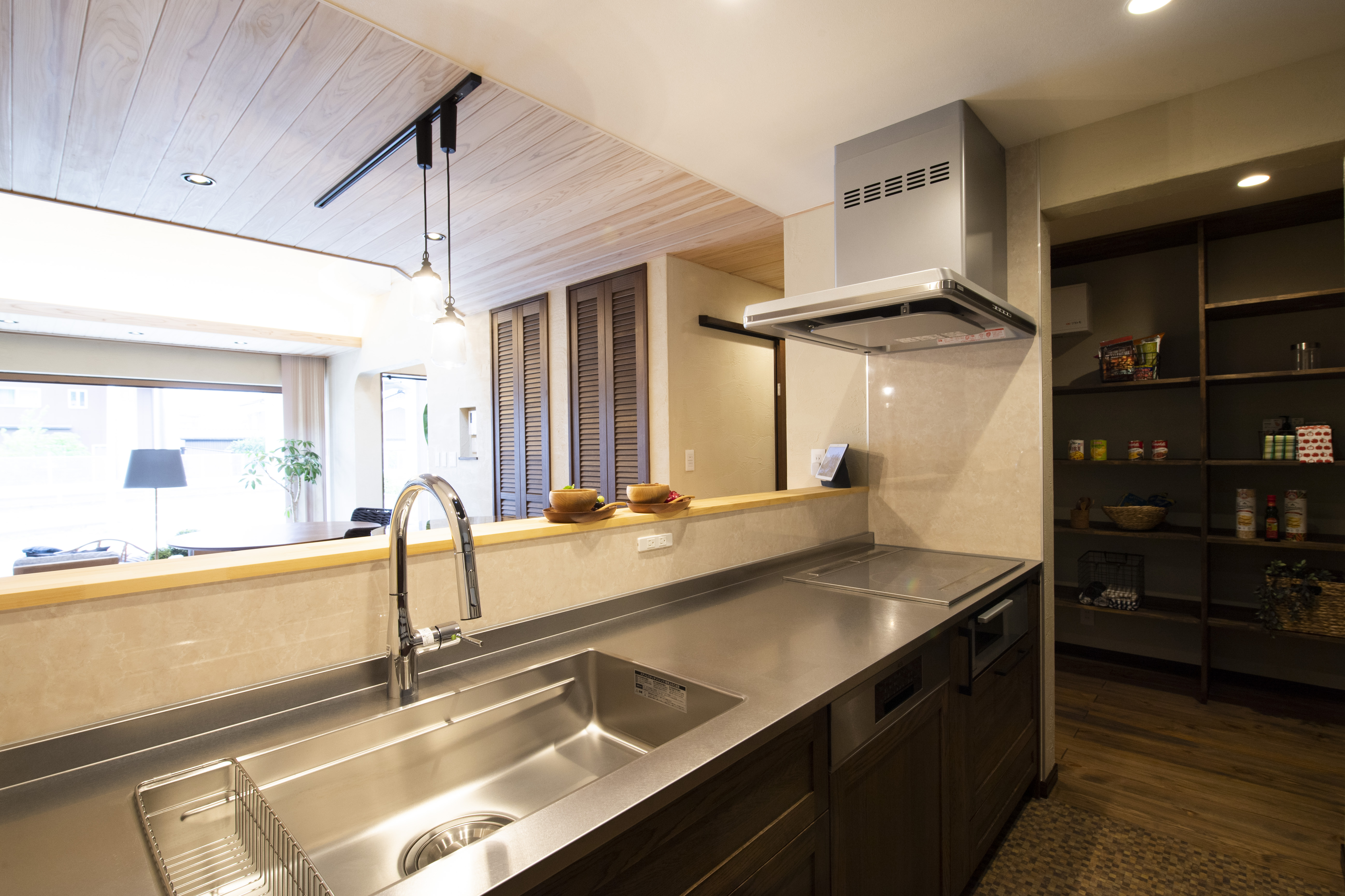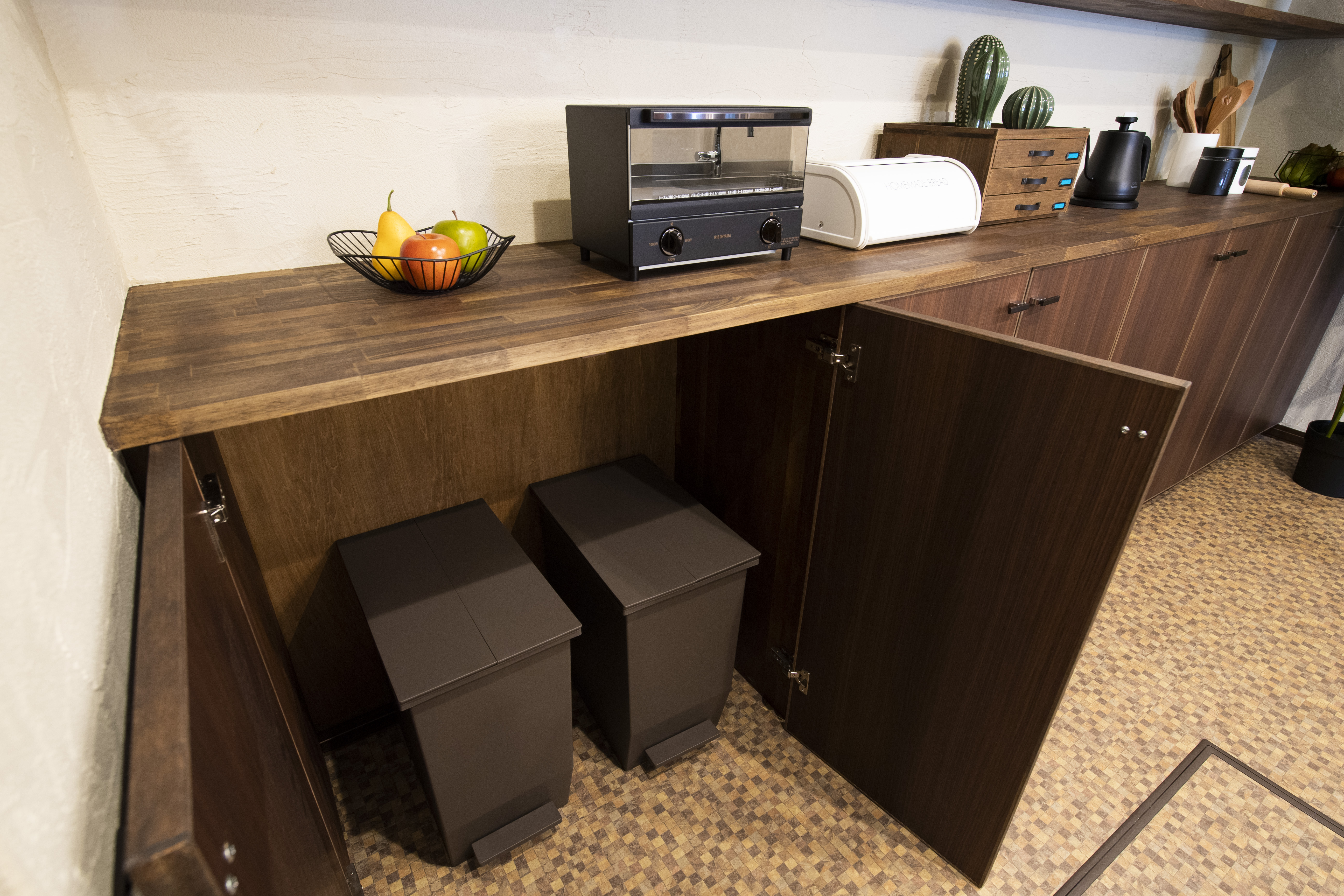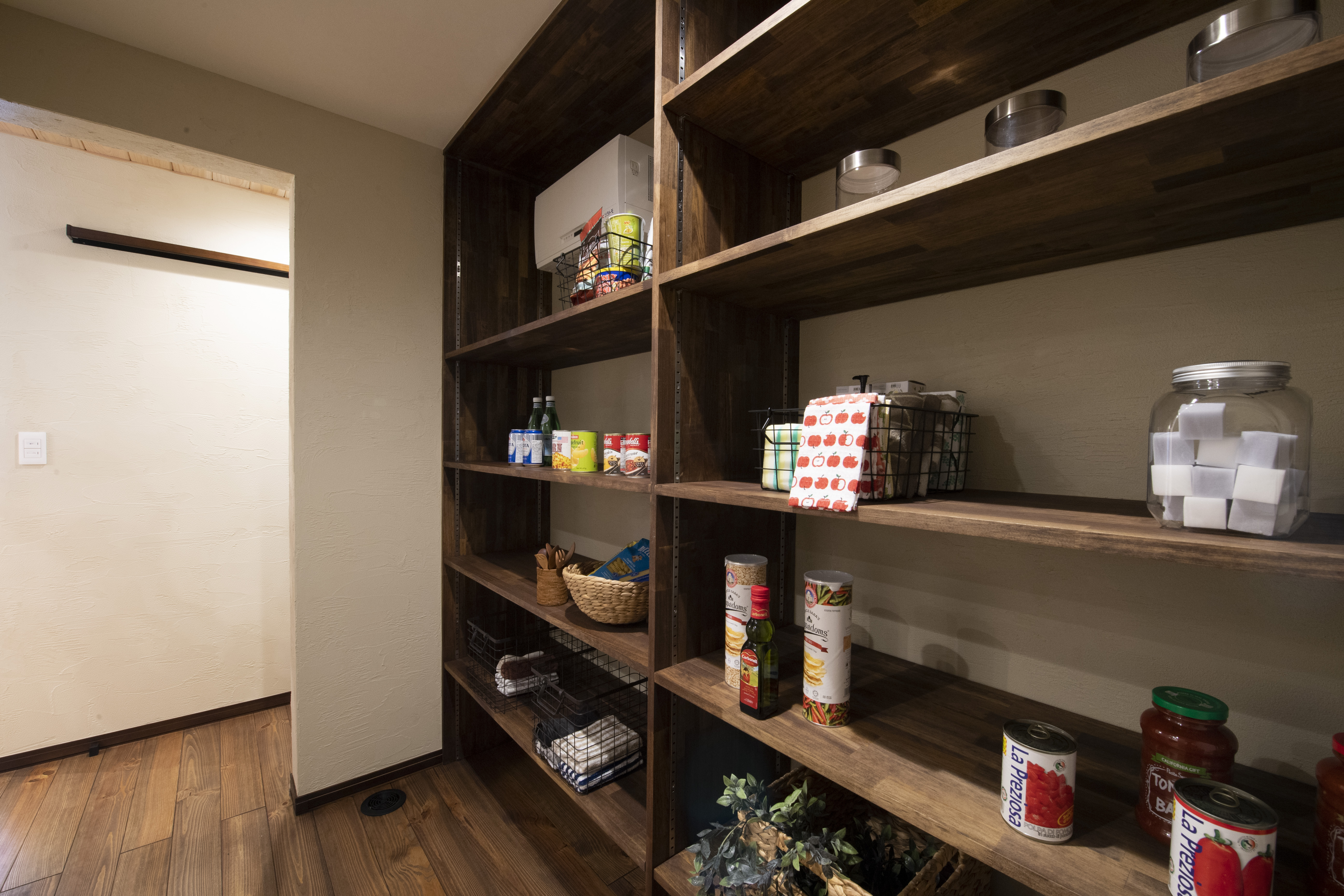 造作収納・パントリー:大容量のパントリーをはじめ、ゴミ箱の目隠しを兼ねたキッチン収納など、見た目もすっきり、使い勝手も抜群の造作収納を随所に配置。