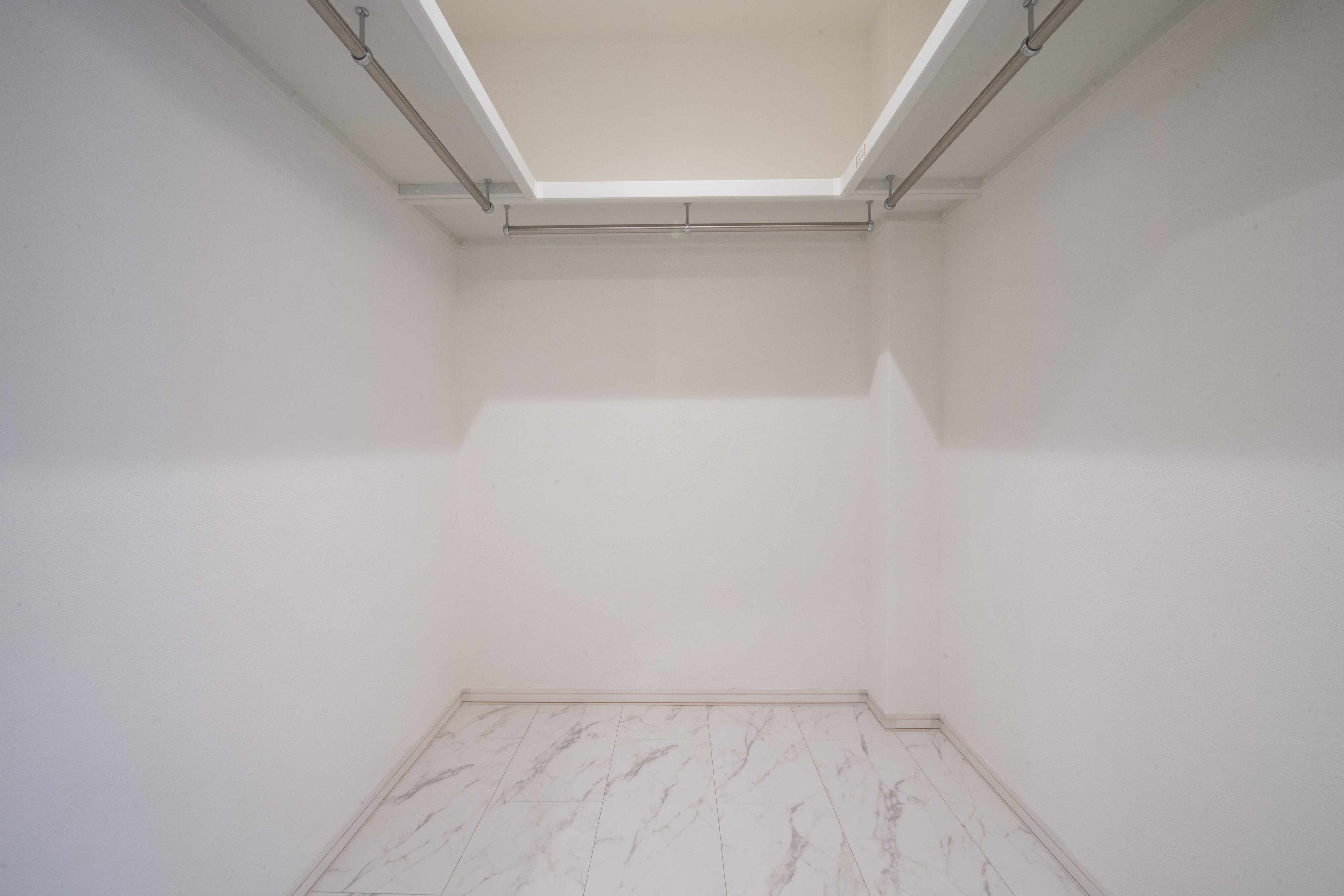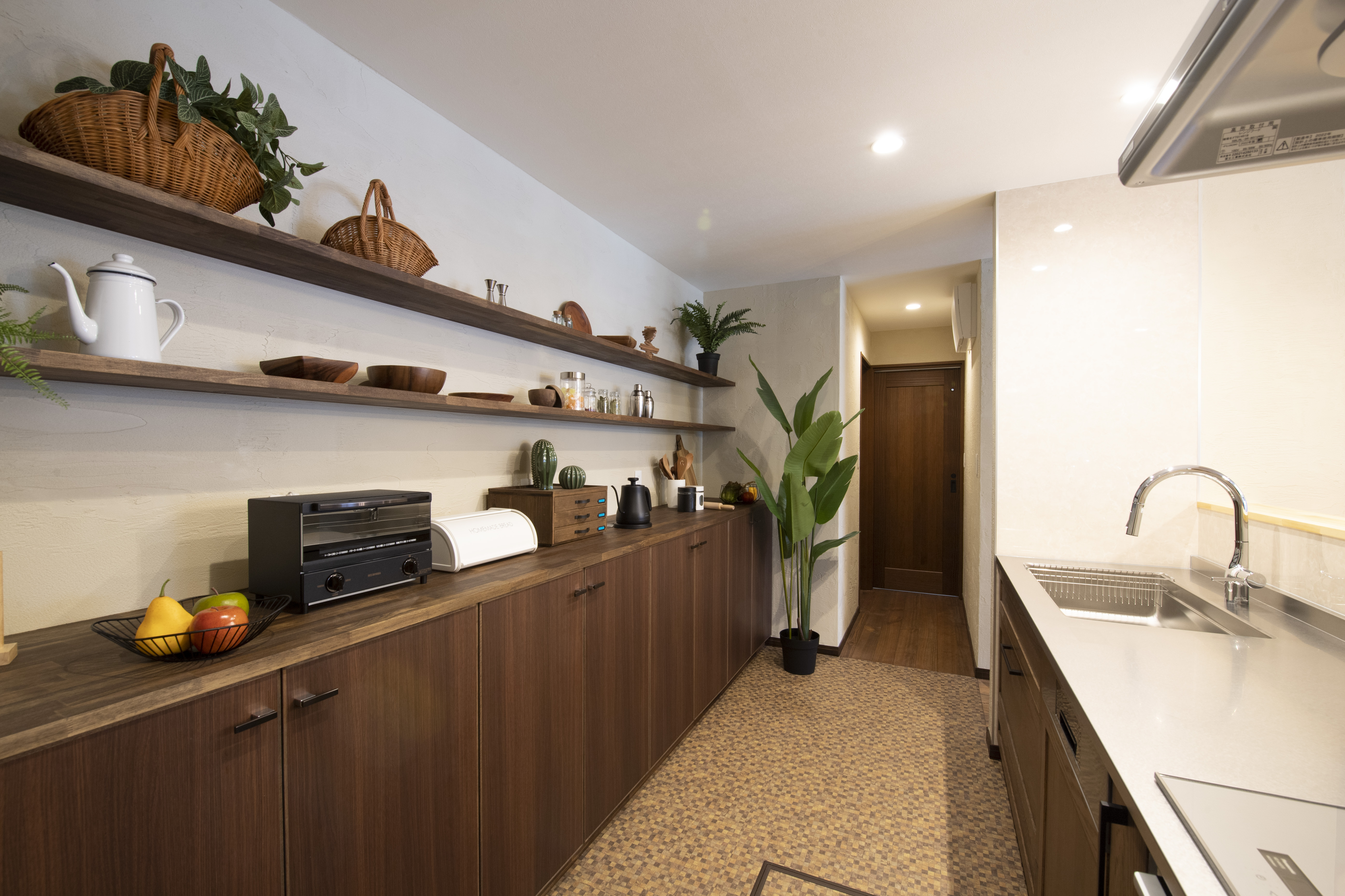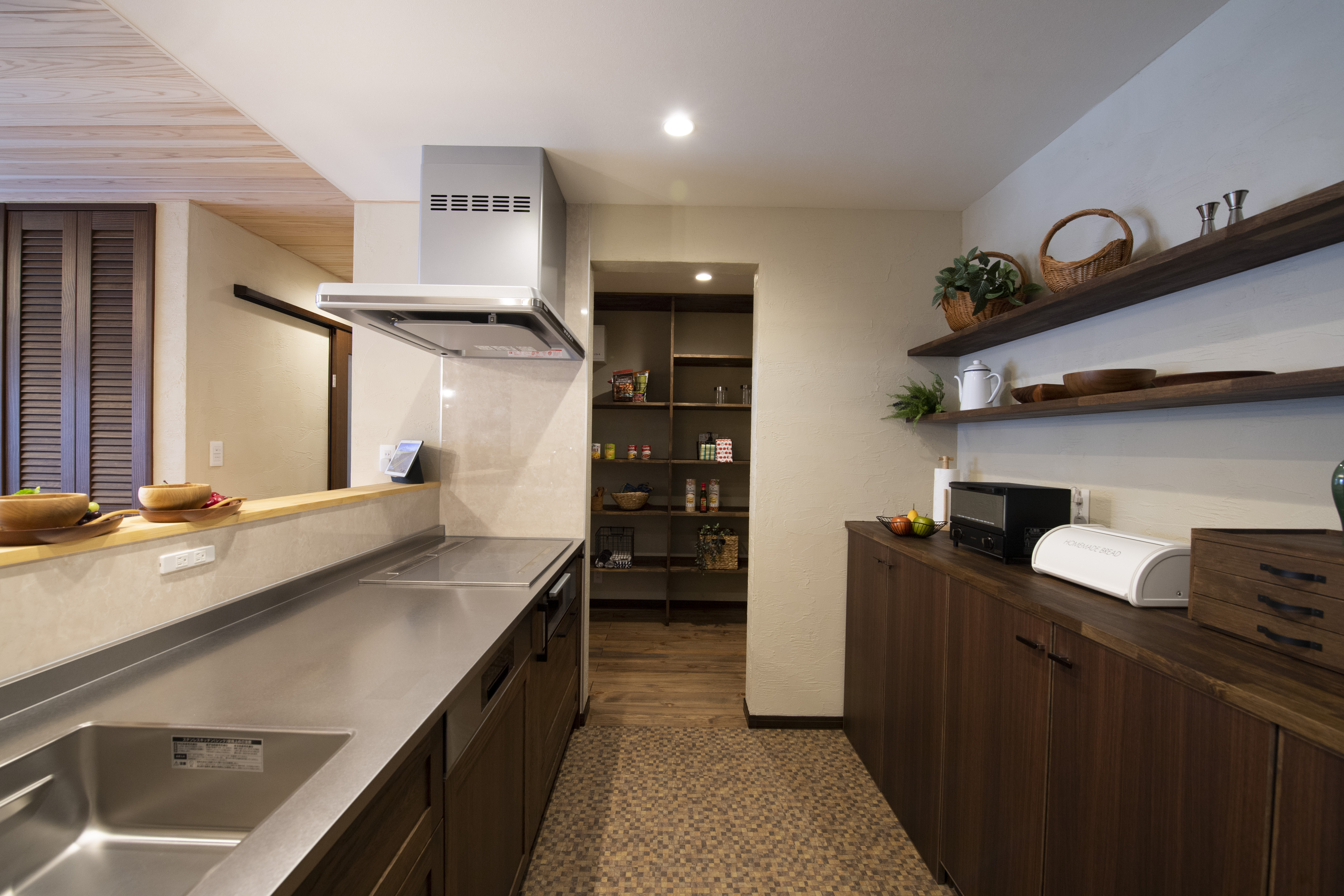 造作収納・パントリー:大容量のパントリーをはじめ、ゴミ箱の目隠しを兼ねたキッチン収納など、見た目もすっきり、使い勝手も抜群の造作収納を随所に配置。