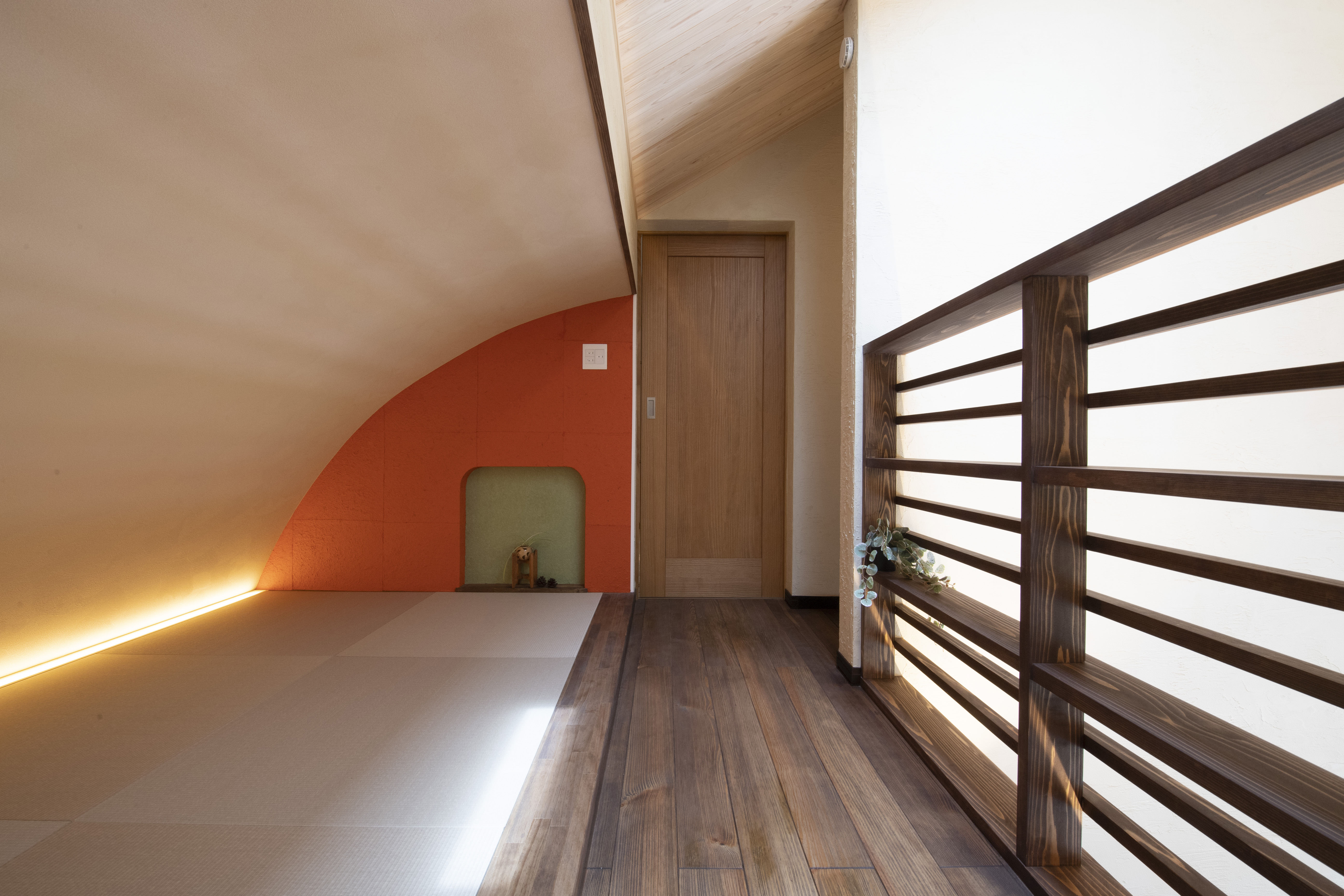ヌック:天井へと続くゆるやかなカーブが印象的な、2階のこもり感ある秘密基地のようなスペース。読書や趣味など、自分だけの時間をゆっくり楽しめる特別な場所です。