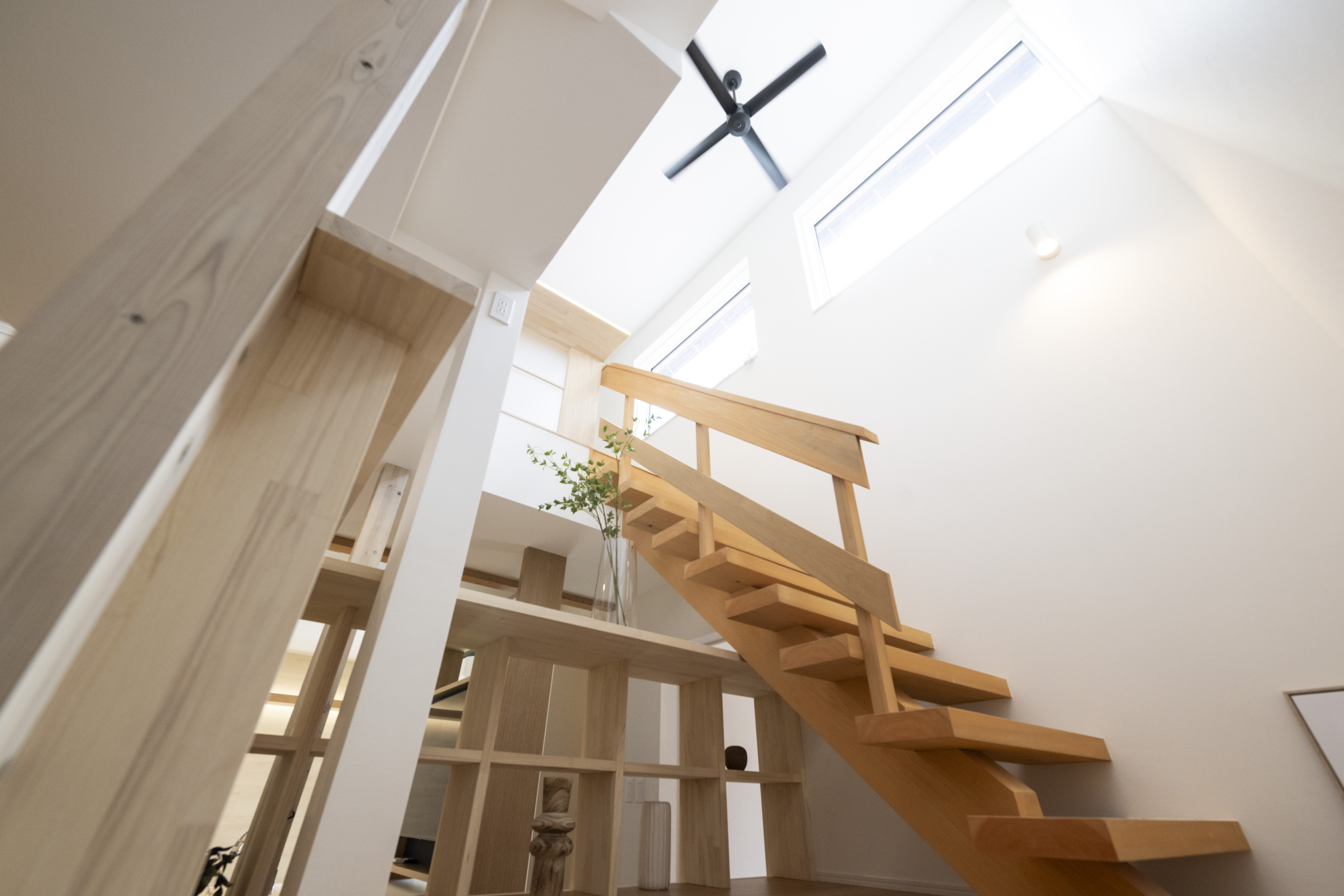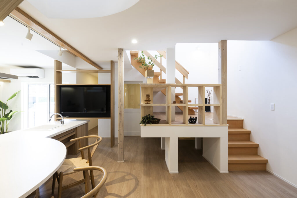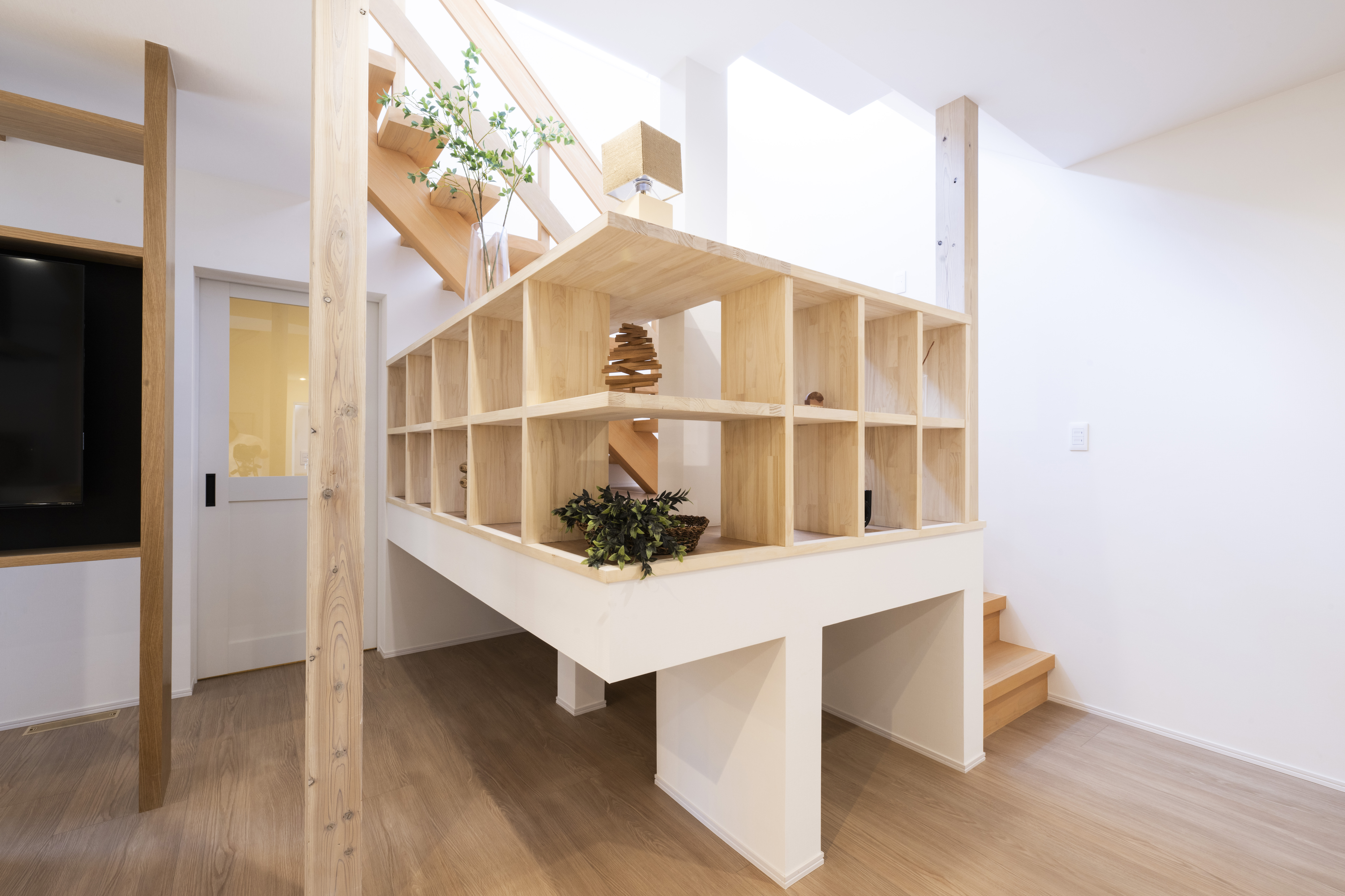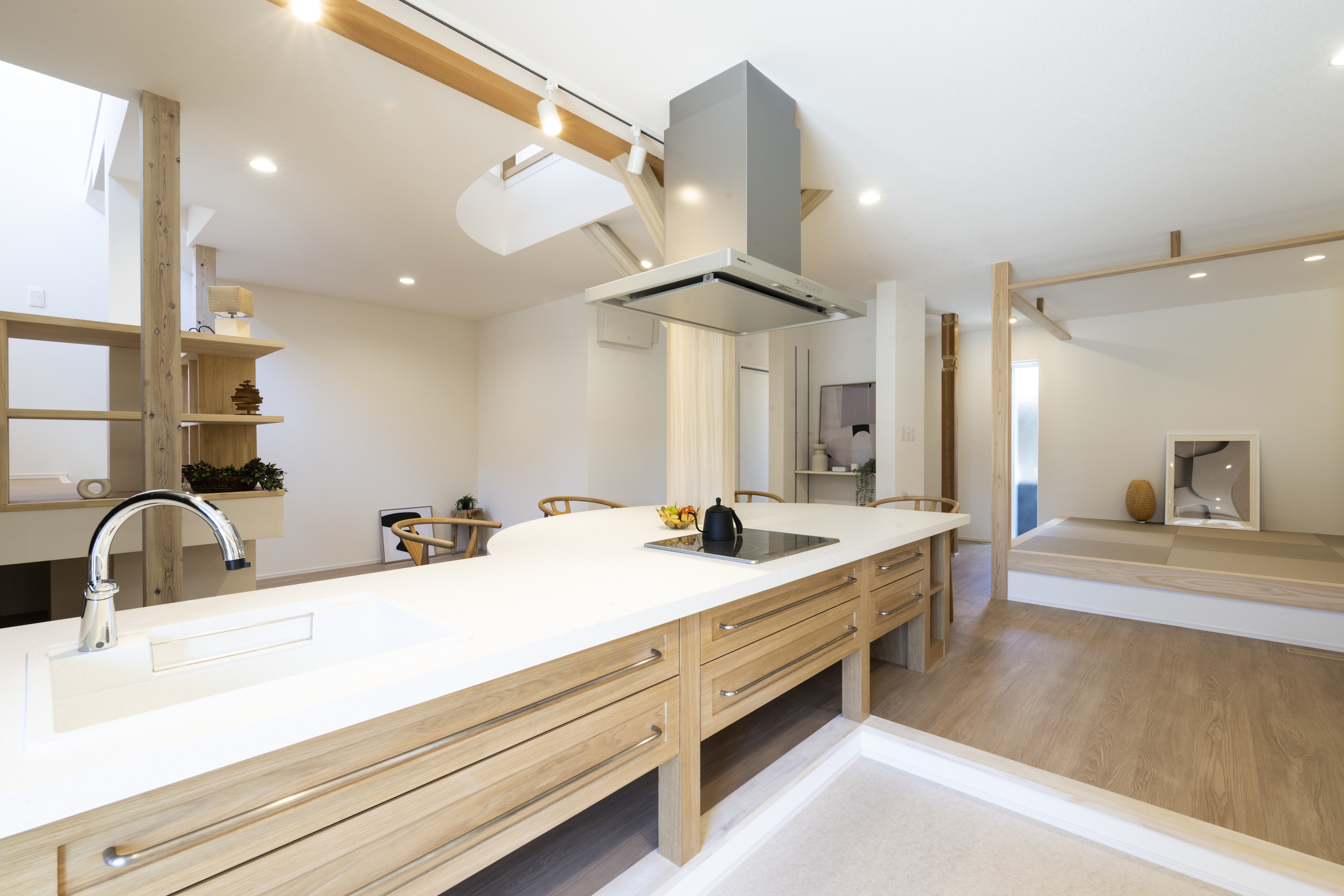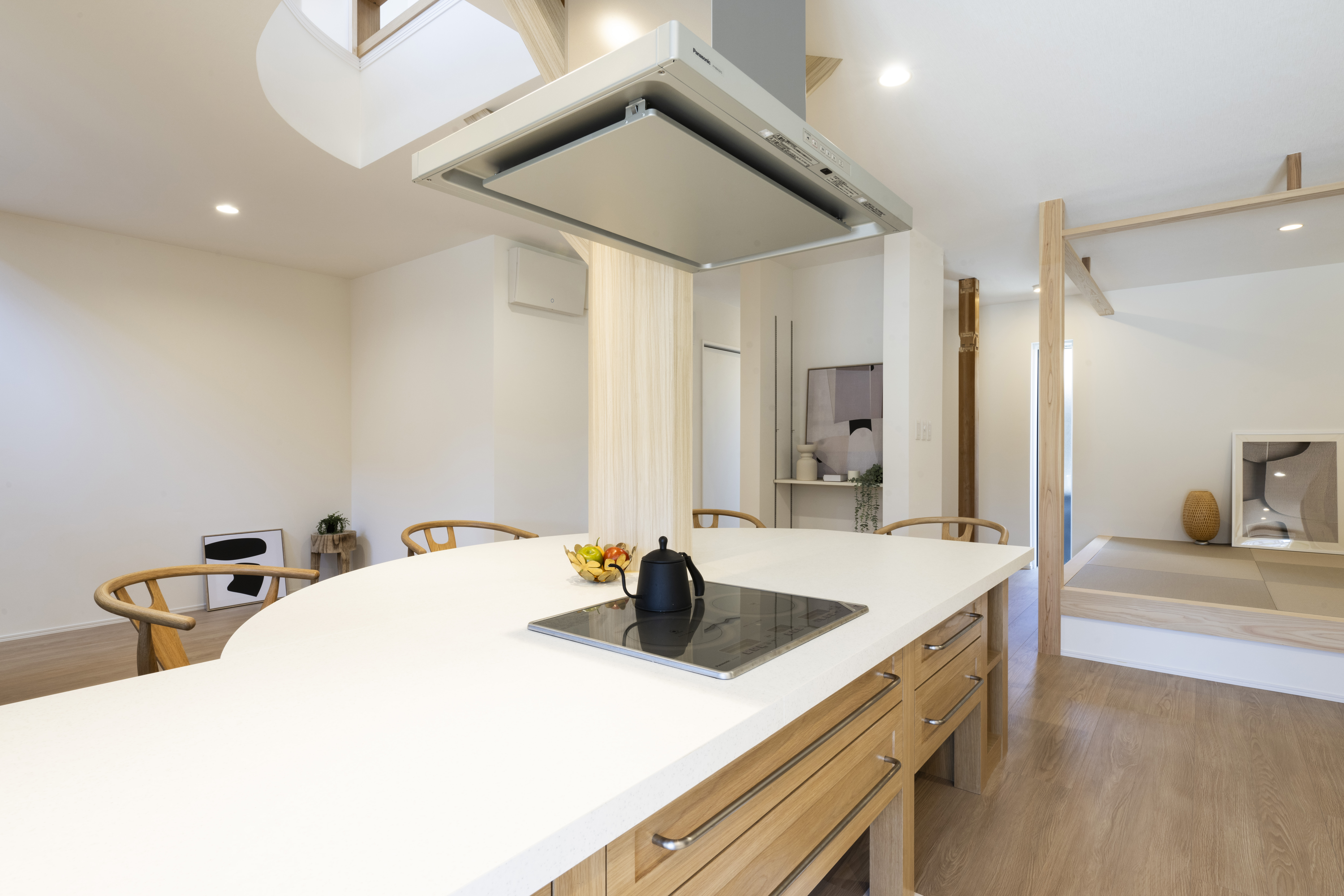 デザイン・造作:白を基調とした明るく広い印象の室内に、造作キッチン・造作階段・小上がりの畳コーナー・多目的スペース・吹き抜けなど、目で見て楽しい造作家具を随所に配置。暮らしに彩りと個性を添えています。