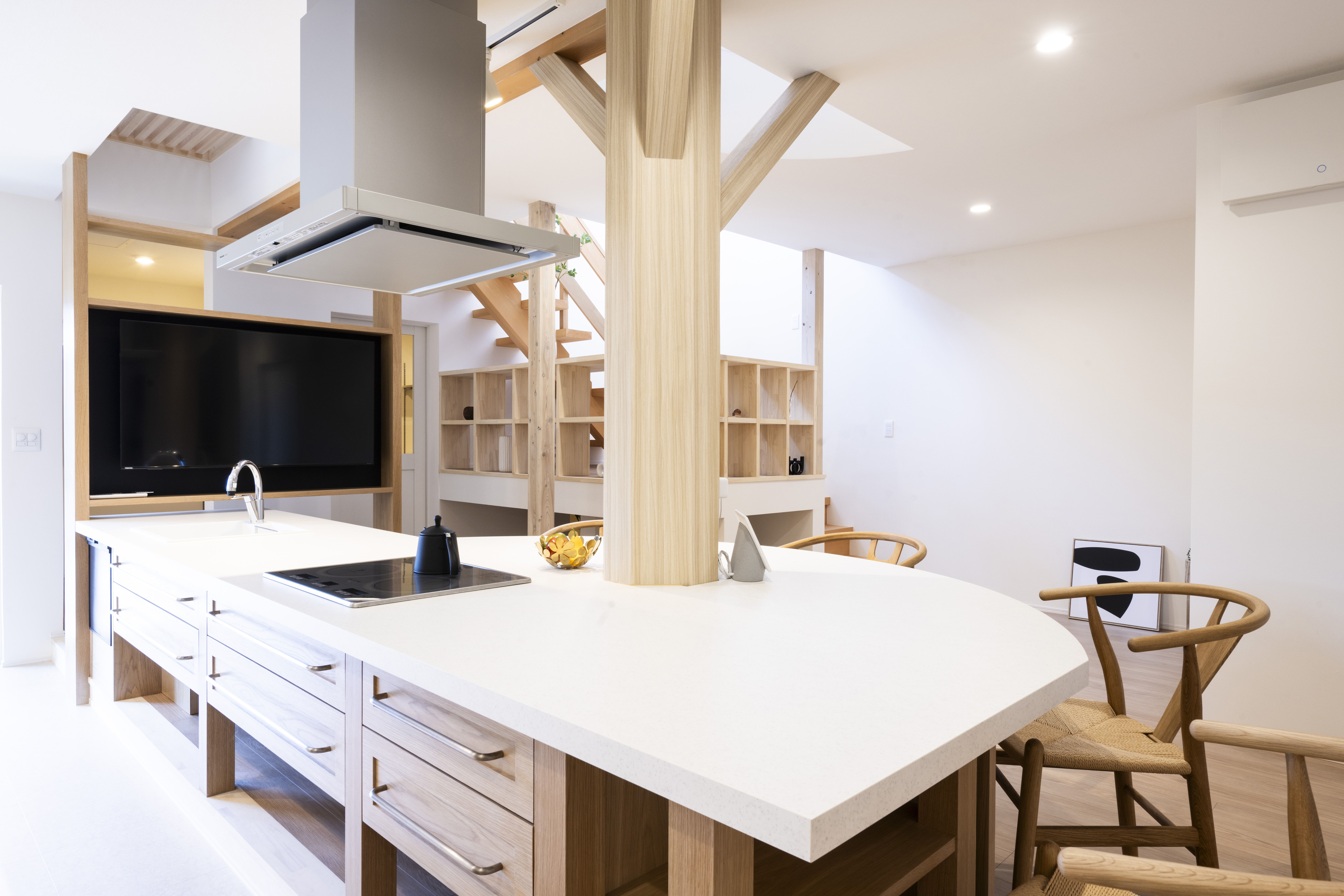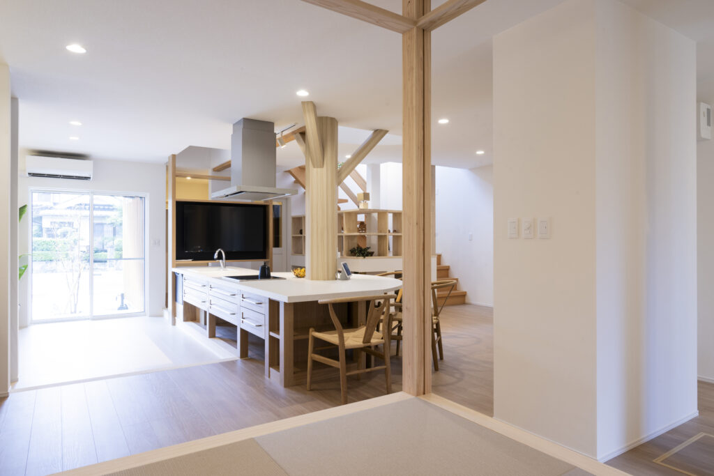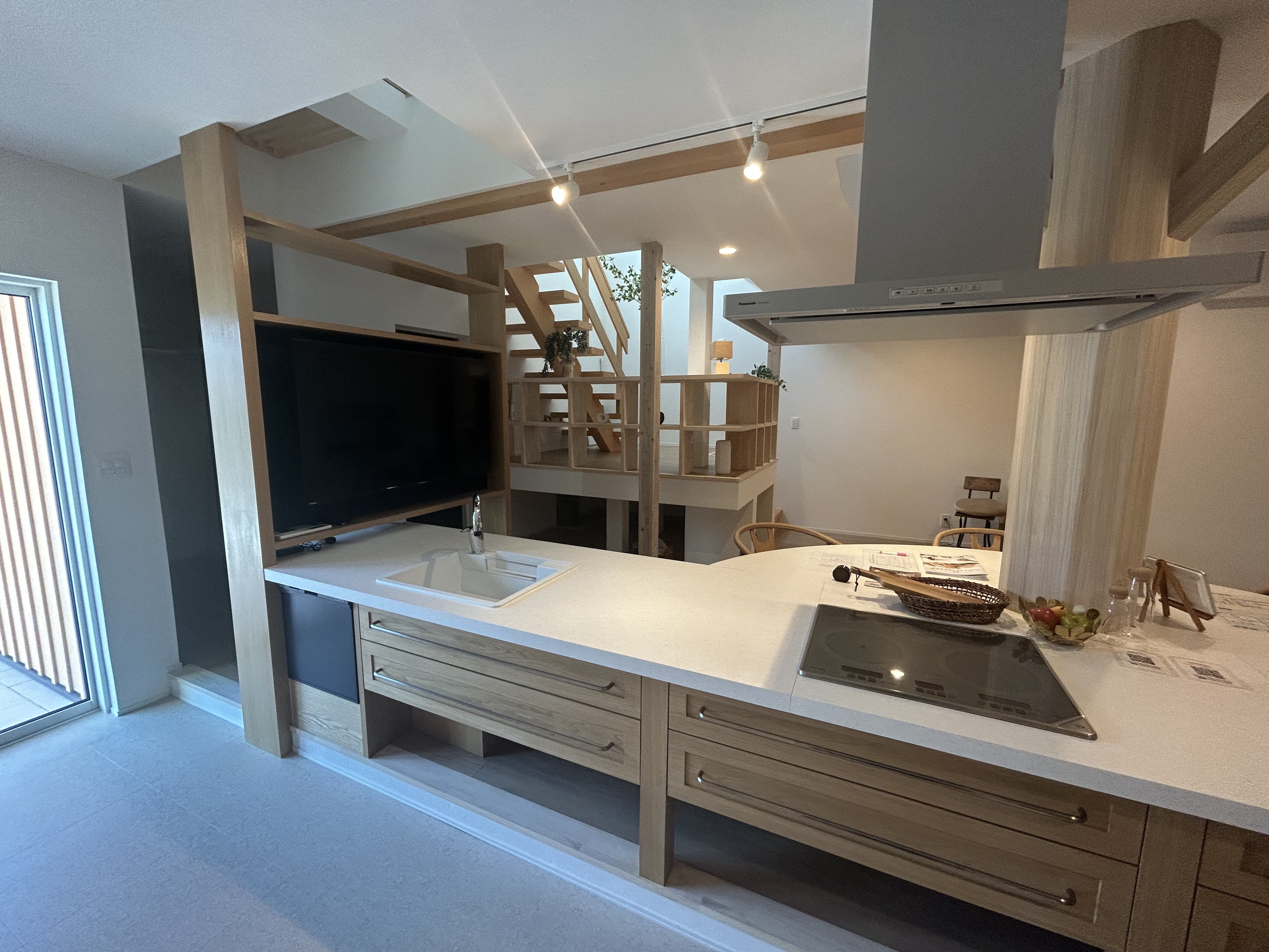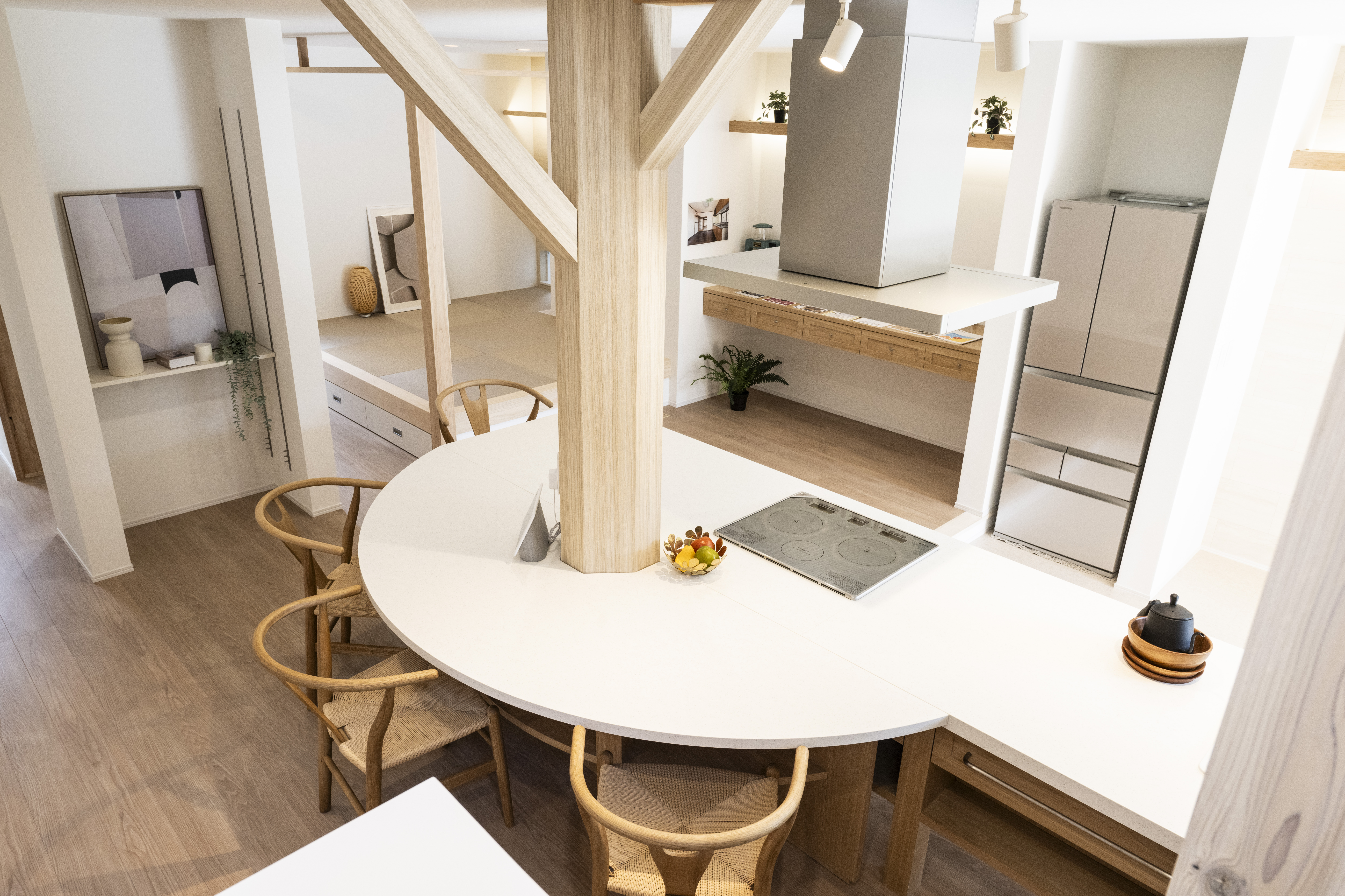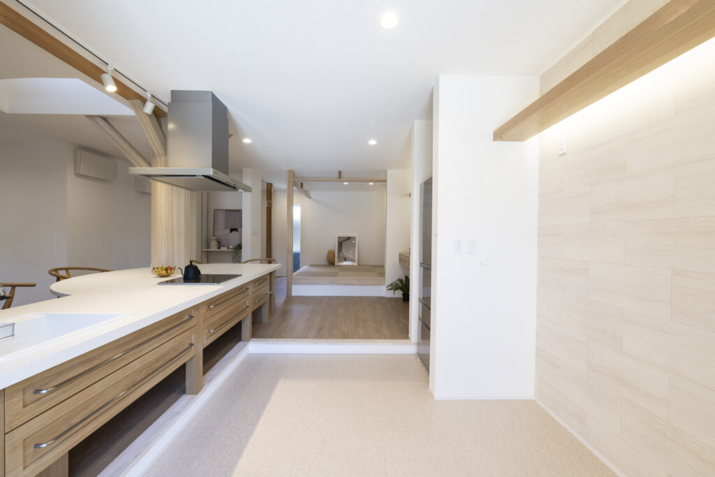 デザイン・造作:白を基調とした明るく広い印象の室内に、造作キッチン・造作階段・小上がりの畳コーナー・多目的スペース・吹き抜けなど、目で見て楽しい造作家具を随所に配置。暮らしに彩りと個性を添えています。