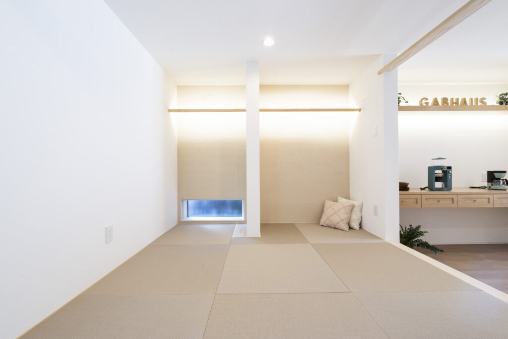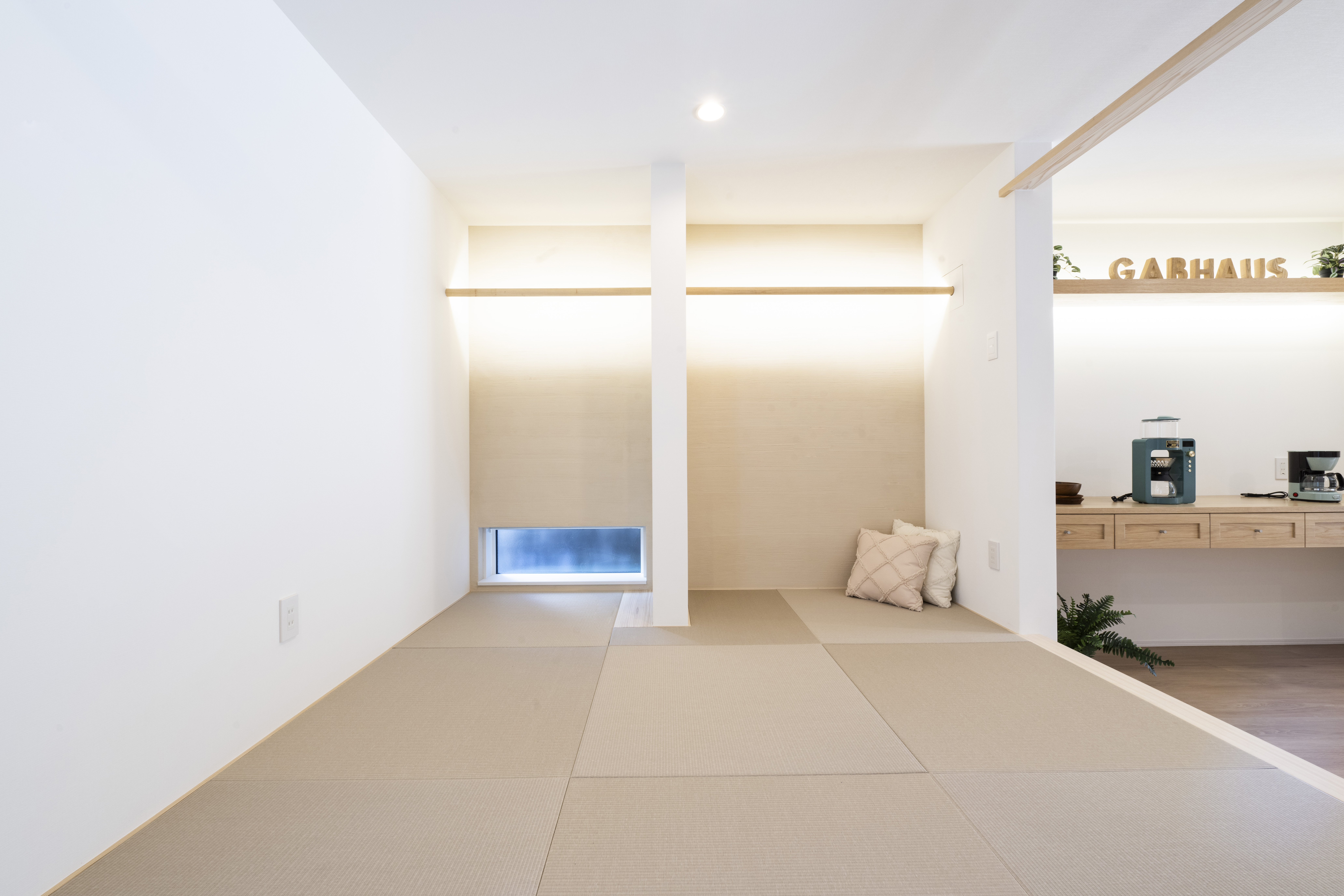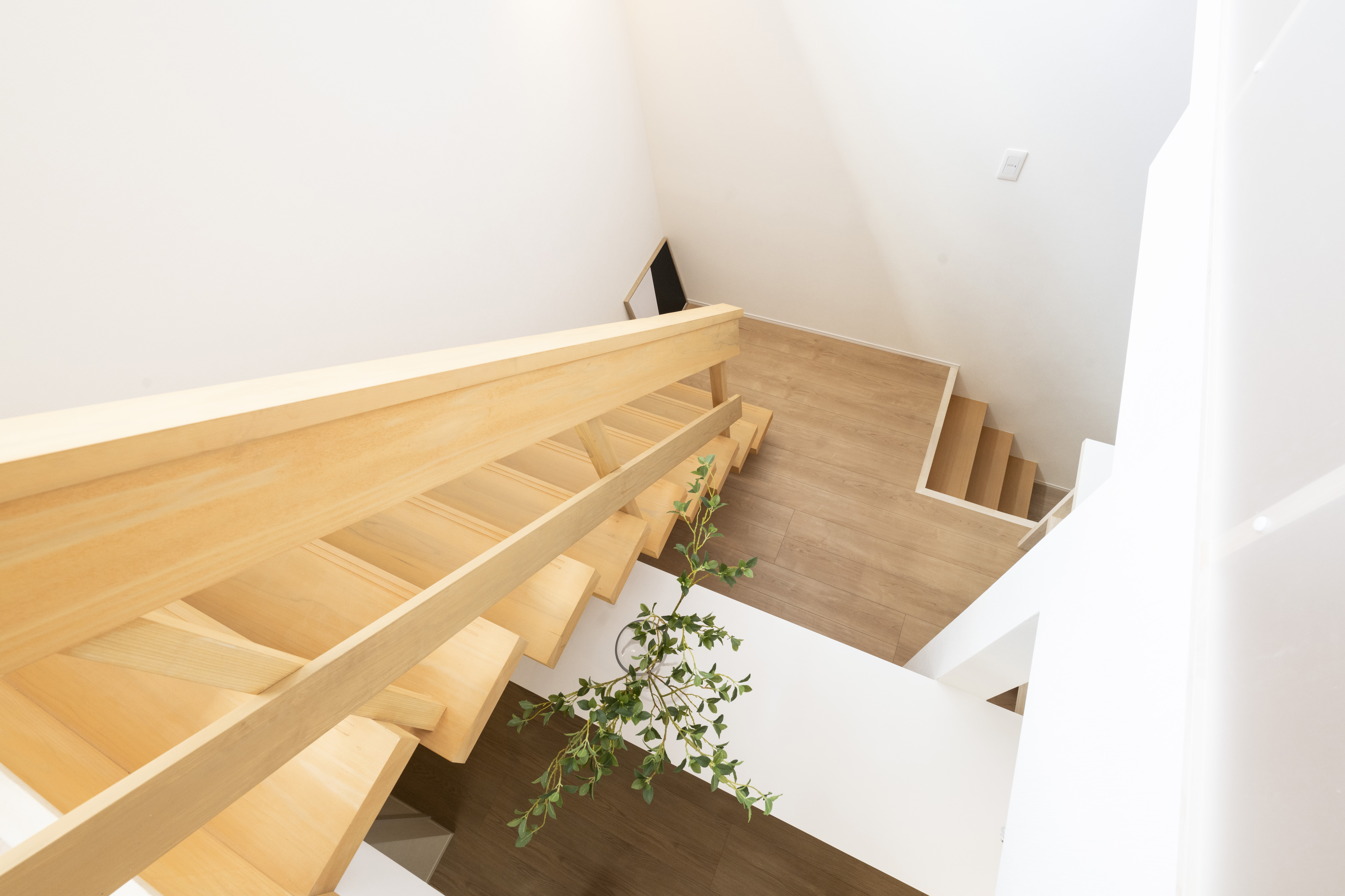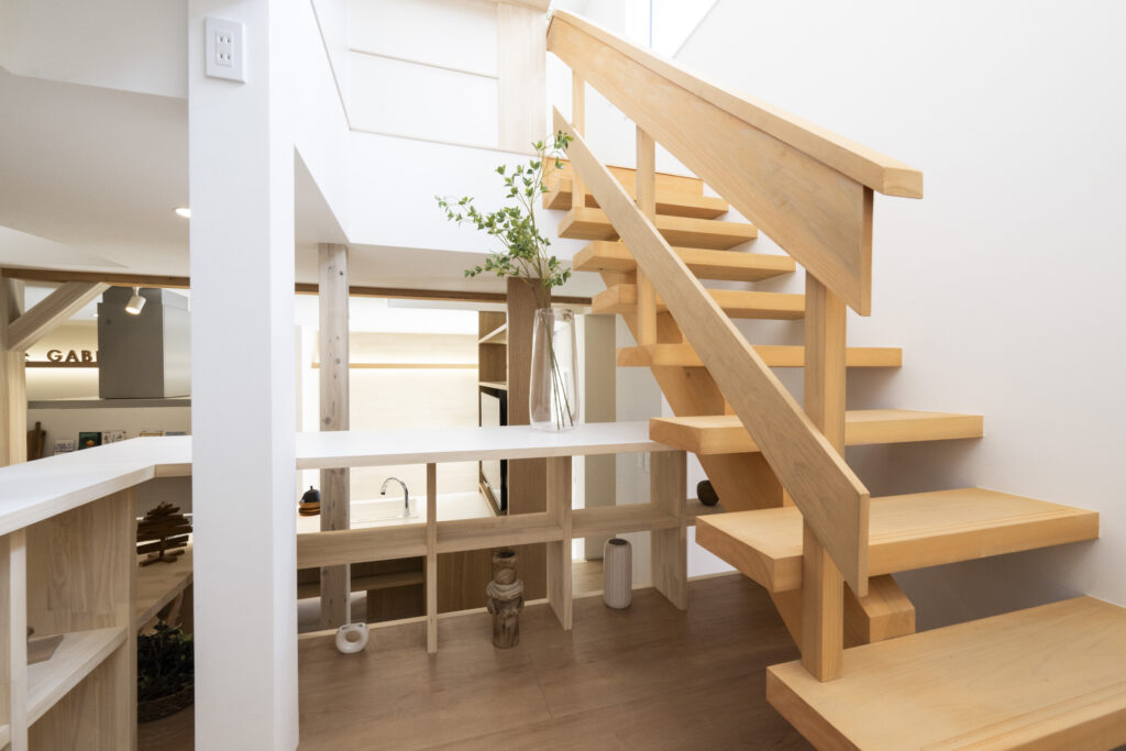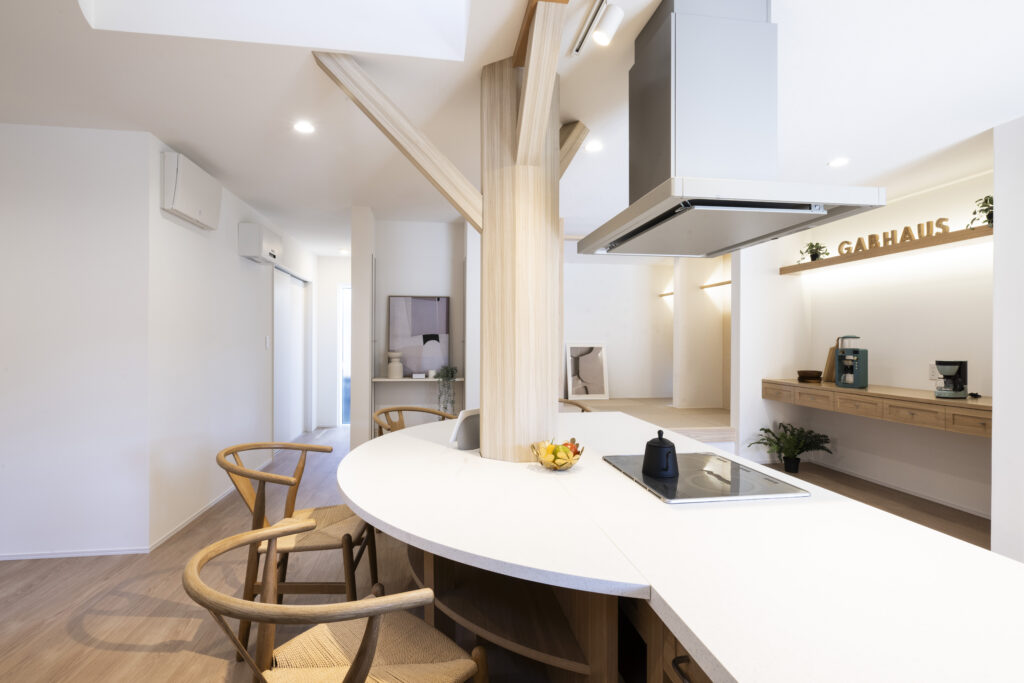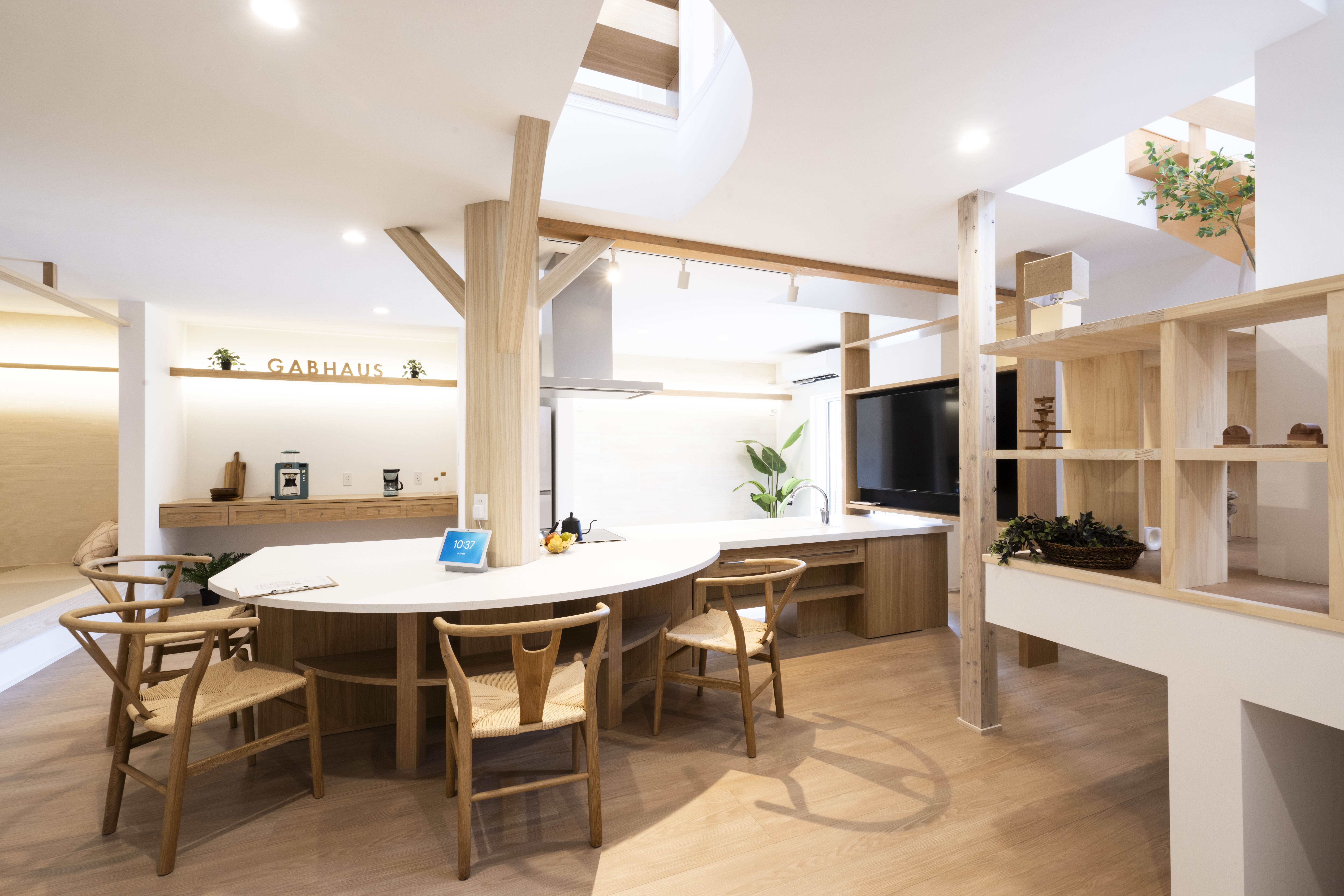 デザイン・造作:白を基調とした明るく広い印象の室内に、造作キッチン・造作階段・小上がりの畳コーナー・多目的スペース・吹き抜けなど、目で見て楽しい造作家具を随所に配置。暮らしに彩りと個性を添えています。